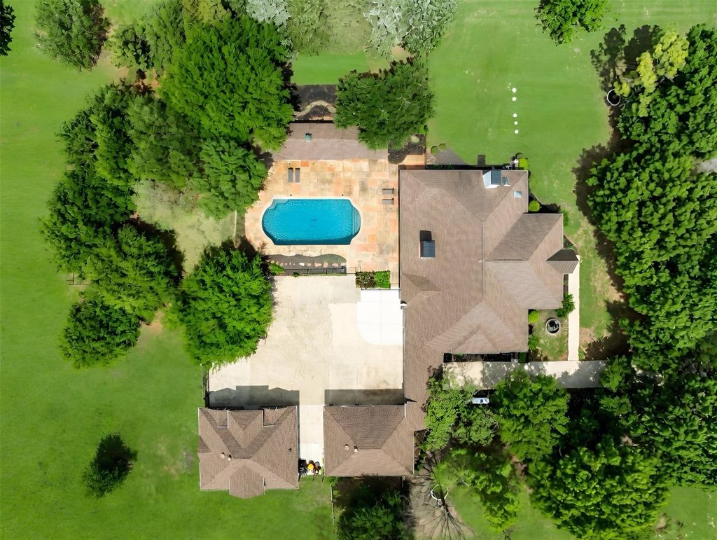 Set on 3.54 beautifully treed acres in sought-after Lovejoy ISD, this exceptional Fairview estate offers privacy, luxury, and flexibility with a large PebbleTec pool, separate guest house, detached 3-car garage, insulated shop-barn, seasonal pond, and horse-friendly grounds. The main residence features handscraped hardwoods, fresh interior paint, updated lighting, plantation shutters, formal living and dining, dry bar with wine refrigerator, butler’s pantry, private study with built-ins, and a chef’s kitchen with granite countertops, oversized island, dual copper sinks, and premium stainless built-in Viking appliances, including a commercial-grade 8-burner gas cooktop and double ovens. The family room includes vaulted ceilings and a cut-stone wood-burning fireplace with gas starter. The primary suite offers a sitting area and direct outdoor access, while the renovated bath features marble finishes, a freestanding soaking tub beside a see-through fireplace with gas logs, frameless glass shower, dual vanities, and cedar closet. A separate wing includes a game room, 2 bedrooms, and 2 updated baths. Approximately 90 feet from the main home, the separate 1,080 SF guest house includes a recently added luxury kitchen, updated bath, walk-in pantry, and spacious his-and-her walk-in closet, ideal for guests, multigenerational living, or a mother-in-law suite. Rear parking accommodates 6+ vehicles. The insulated 20' x 20' shop-barn includes a large electric roll-up door and extended covered concrete pad. Recent improvements include 2 newer energy-efficient HVAC systems in the main house (4-ton in 2024 and 5-ton in 2025). Main house, guest house, and detached garage are all built with steel framing, including steel wall studs and steel roof trusses.
