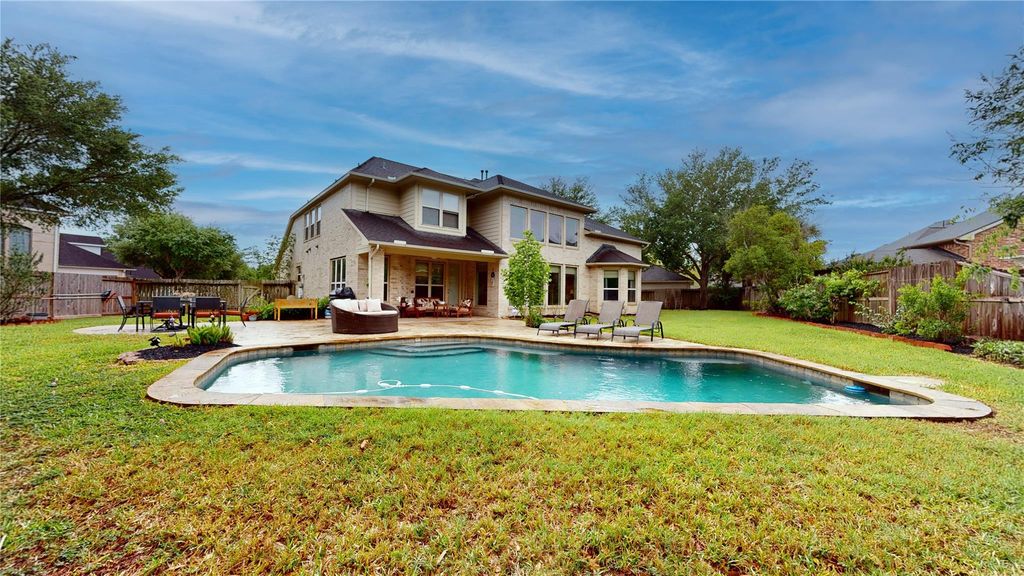 Nestled on an oversized 13,000+ sq ft cul-de-sac lot, this stunning 5-bedroom, 4.5 bathroom, 3885 sq ft of elegant living with a spectacular lakefront setting and private pool. From the moment you arrive, the stately curb appeal and mature trees create an inviting first impression. Inside, spacious living areas are designed for everyday comfort and entertaining. The backyard oasis is the true SHOWSTOPPER, featuring sparkling pool, expansive stamped concrete patio, and breathtaking lake views with fountain backdrop. Enjoy morning coffee by the water or host unforgettable sunset gatherings. This home blends space, privacy and resort style-living all zoned to highly acclaimed exemplary Katy ISD schools. Contact your agent today for private showing!