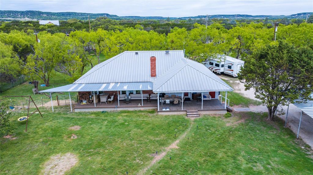 Experience refined country living just outside of Buffalo Gap, minutes from Abilene State Park and the iconic Perini Ranch Steakhouse. Set on 1.45 acres, this thoughtfully upgraded ranch style home offers privacy, comfort, and modern sophistication. Inside, an open, light filled layout is anchored by a warm wood burning fireplace with insert and blower. Extensive upgrades since 2025 include seamless luxury vinyl plank flooring throughout, with original hardwood preserved in the entry, and elegant granite surfaces in the kitchen and bathrooms. The redesigned kitchen features a custom breakfast bar, stainless steel appliances, and abundant cabinetry. Ideal for everyday living and entertaining. The primary suite is a private retreat with spa-inspired finishes, including a jetted tub, dual vanities, and a beautifully updated walk in shower. Both bathrooms are fully remodeled with modern multi source showers, slip resistant stone floors, and cohesive high end fixtures. Beyond aesthetics, the home is equipped for today’s lifestyle with a new 200 amp panel, electrical upgrades,10GB capable wired networking, and a dedicated office filled with natural light. Perfect for remote work! Outdoors, the property shines. A fully equipped 40 by 26 metal shop with water, electricity, air lines, and enhanced lighting offers exceptional versatility. Added conveniences which include a washer and dryer, refrigerator, utility sink, and wood burning furnace, make it ready for immediate use. An electric gated entry, improved driveway, and RV hookup provide both functionality and ease. A charming, partially renovated barn offers endless potential as a guest house, studio, or additional living space. An idyllic goat barn, currently home to two goats, adds a delightful touch of country living and is perfect for hobby farming. Blending modern upgrades with timeless Texas charm, this one of a kind property offers space to live, work, and create. Just minutes from town, yet worlds away!