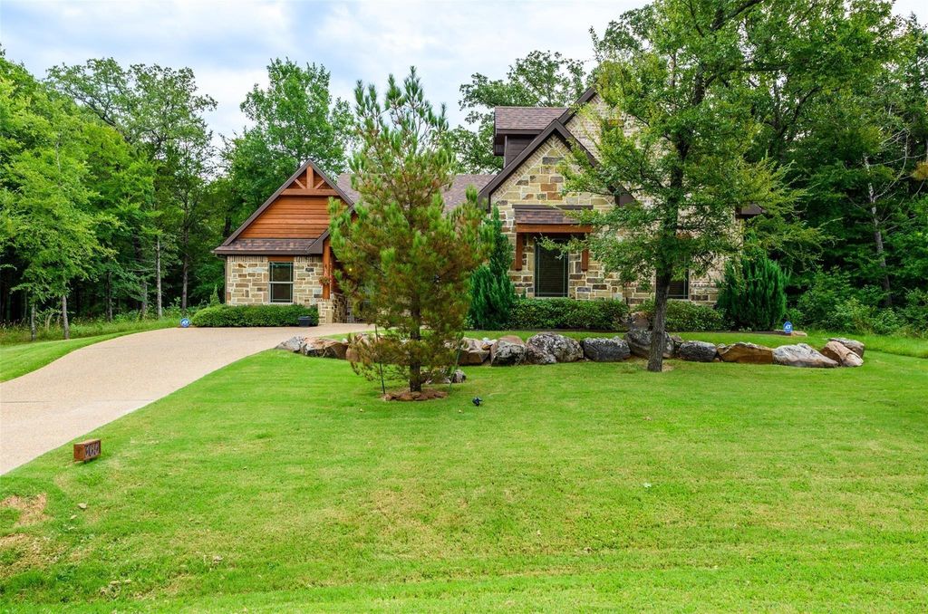 Experience the perfect blend of luxury and laid-back lake living in the luxurious, gated community of Rock Creek Resort on Lake Texoma. This exceptional custom-built home offers more than just a place to live—it delivers a true resort-style lifestyle. Residents enjoy access to a top-ranked, Jack Nicklaus designed golf course, a fully stocked pro golf shop, an elegant clubhouse and restaurant with on-site dining, a fitness and spa center, a community pool, and even a private boat ramp and marina—everything you need for relaxation and recreation right at your doorstep. Inside, the home is thoughtfully designed with both comfort and style in mind. The open, functional floor plan is enhanced by high-end custom finishes, including a stunning stone fireplace, impressive oversized wooden beams, and rich wood flooring that adds warmth and character throughout. The kitchen serves as a central gathering space, featuring a large island with beautiful stone detailing—perfect for entertaining or everyday living. The layout offers privacy and flexibility, with a split-bedroom design that places the spacious primary suite on its own side of the home. Upstairs, a versatile fourth bedroom can easily function as a bonus room, media space, or home office to suit your needs. The sun room off the primary living area in the back offers a warm, peaceful gathering place for morning coffee or afternoon relaxation. Whether you're looking for a weekend retreat or a vibrant community with premium amenities, this home is your opportunity to enjoy the best of both worlds. Start your next chapter surrounded by natural beauty, comfort, and refined living.