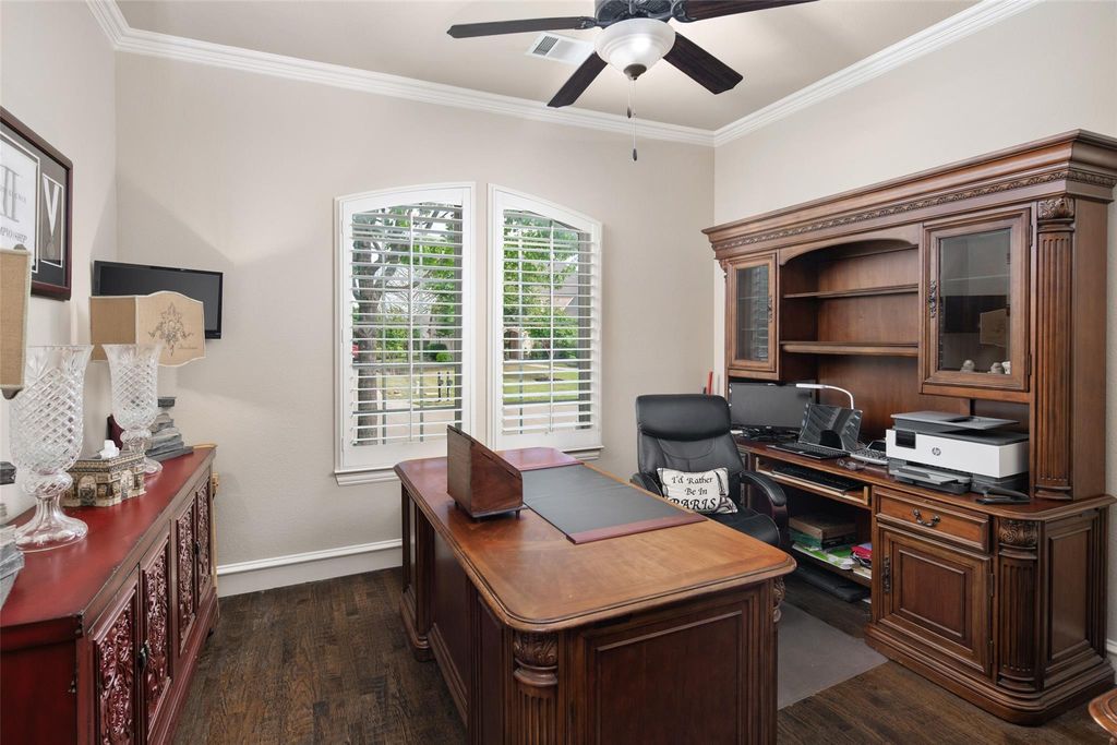Where Everyday Magic Begins! Imagine turning onto a peaceful corner lot in one of Prospers most beloved neighborhoods and instantly feeling “this could be home.” Nestled on .38 acres, this warm and inviting residence is built for real family living and connection. It’s the perfect setting for your next chapter, where timeless quality meets the opportunity to write your own story. Inside, the open and flowing layout welcomes you with gleaming nail-down hardwood floors and plantation shutters that frame windows filled with natural light. The media room is conveniently located downstairs — ideal for family movie nights without heading upstairs. Generous room sizes give you flexibility for a home office, playroom, or guest suite, while the three-car garage offers plenty of space for vehicles and everyday gear. Step outside to discover your private backyard oasis. A detached kids playroom with electricity creates a magical retreat for imagination and adventure. The true highlight is the expansive covered patio addition — over 400 square feet featuring a built-in gas grill, running water, and power. This seamless indoor-outdoor living space transforms ordinary days into something special. Added peace of mind comes with a brand-new roof installed just one year ago using durable Class 4 hail-proof shingles. Deer Run embodies small-town charm with tree-lined streets and friendly neighbors. Prosper’s highly rated schools, parks, shopping, and dining are just minutes away, while Frisco and McKinney are easily accessible for bigger-city conveniences — all while enjoying the peaceful rhythm of suburban life. This home stands as a beautiful, solid canvas — classic and well-built, ready for your personal style and future memories. Come feel the warmth: hardwood floors underfoot, a gentle breeze on the patio, and the simple joy of a backyard made for living. Here is where your family’s next beautiful chapter begins. Zoned for Walnut Grove HS!