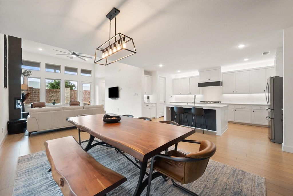 Exquisite Modern Living as you step into this breathtaking Global Luxury residence that seamlessly combines sophistication with modern comforts. Every detail of this home reflects quality craftsmanship and luxurious living. Upon entering, you’re welcomed by a foyer that opens into an airy, open-concept living space filled with natural light warmed by elegant LVP flooring. A sleek electric fireplace creates a sophisticated focal point, while designer lighting, fixtures, and modern mirrors elevate the home’s model-like feel throughout. The gourmet kitchen is the true centerpiece—featuring top-of-the-line stainless steel appliances, custom cabinetry, an expansive island ideal for entertaining, and enhanced above- and under-cabinet lighting that adds both ambiance and functionality. Adjacent to the kitchen, the dining area offers a seamless flow for everyday living and gatherings. Each bedroom is a private oasis designed for comfort and style. The primary suite impresses with a generous layout, plush finishes, a spa-like en-suite bath with dual vanities and a soaking tub, plus a spacious walk-in closet. The newly added media room is a bonus for entertaining! Additional bedrooms each include spacious closets. Every detail has been thoughtfully considered, including a high-efficiency air purification system integrated into the HVAC for elevated everyday living. Practical upgrades like a custom mud bench add function without sacrificing style. Outside, the home is equally impressive with reimagined landscaping and new pavers that create a private backyard retreat. A covered patio invites outdoor dining and relaxation, overlooking a beautifully manicured lawn—perfect for entertaining or unwinding in your own oasis. This gem offers unparalleled luxury and refinement, a testament to exquisite modern living. Discover a property where every detail radiates quality and elegance! Watson Branch features a 10-acre linear park with an on-site trail and playground! .