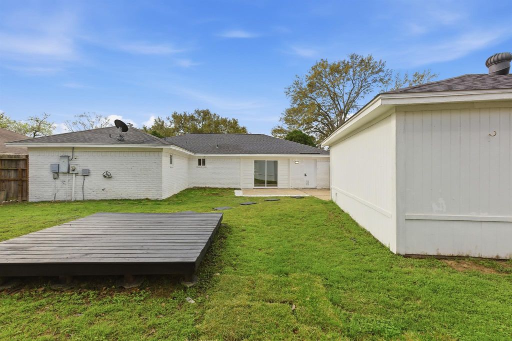 Stunning fully renovated home in the heart of Katy! This beautifully updated residence showcases a bright open-concept design with soaring ceilings, dramatic exposed beam, and wood-look ceramic tile flooring throughout. The completely redesigned chef’s kitchen features brand-new cabinetry, quartz countertops, modern backsplash, and a show-stopping waterfall island perfect for entertaining. Major upgrades provide peace of mind, including a new roof (2025), new windows throughout, and a brand-new A/C system. Both bathrooms have been stylishly remodeled with new vanities, plumbing fixtures, tile, and a luxurious walk-in shower with rainfall feature and glass enclosure. Fresh interior paint, new lighting, new doors, and a sliding glass door create a modern, move-in ready feel. Step outside to a spacious backyard ideal for gatherings or relaxing evenings. Over $67K in renovations completed—this home blends modern design with everyday comfort in a prime Katy location.