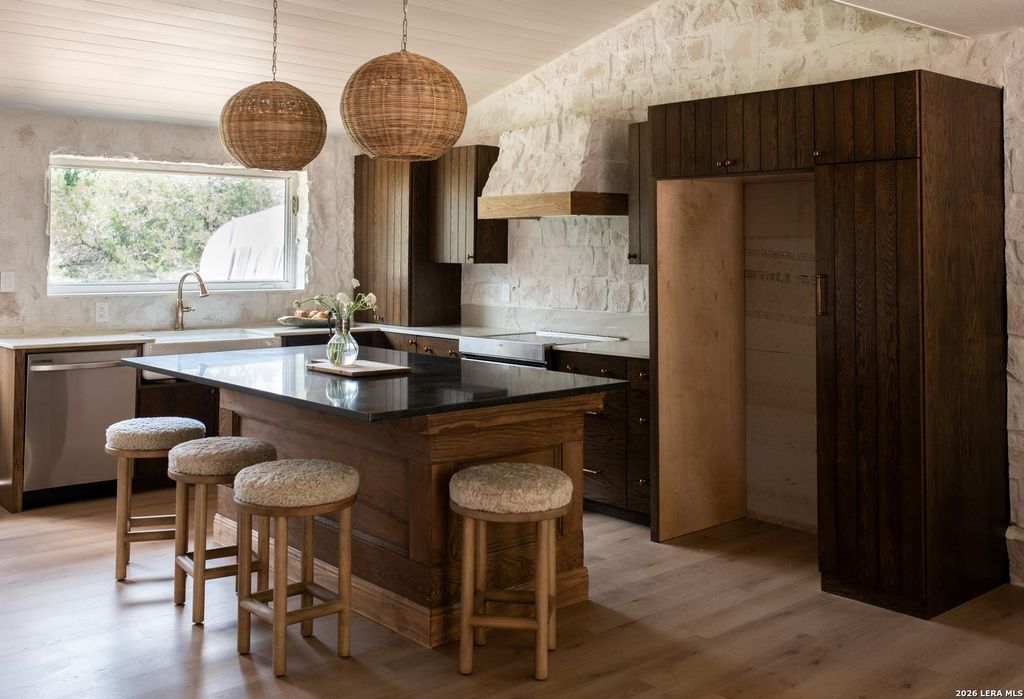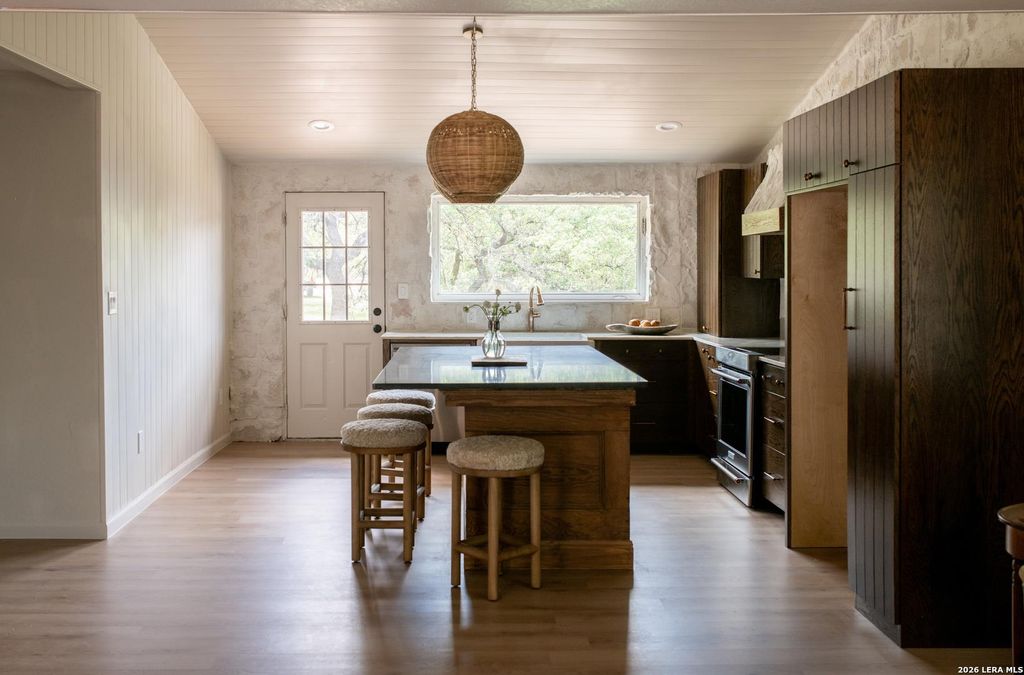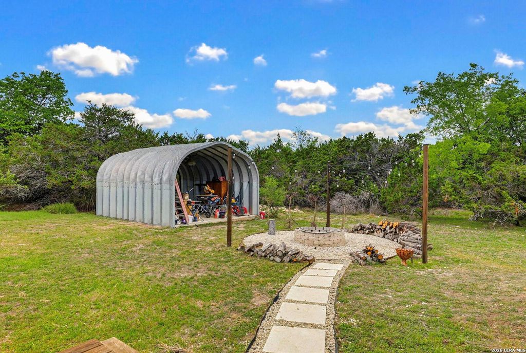 Thoughtfully designed 3 bedroom, 2 bathroom home on half an acre surrounded by mature trees. Fully renovated with high end, natural materials and a warm, elevated feel throughout. Inside features marble and quartzite countertops, custom wood cabinetry, extensive masonry work, and luxury vinyl flooring. The kitchen is filled with natural light and includes a large chef's island perfect for cooking and hosting. Rich oak cabinetry paired with Alamo stone creates a resort like feel. The primary suite includes a fully built out, floor to ceiling closet with maximized storage and integrated drawers. The primary bathroom features custom millwork, limestone flooring, marble tile and countertops, and beautiful natural light. The private backyard is ideal for both relaxing and entertaining, complete with a deck and outdoor fireplace. Property also includes a large metal shop for storage, workspace, or hobbies. Move in ready with thoughtful design, quality materials, and peaceful outdoor livi