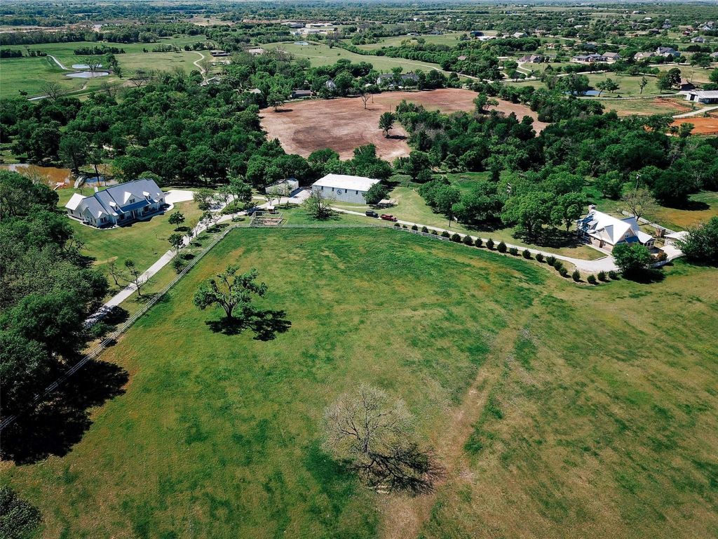 Nestled beneath mature trees and framed by sweeping views, this charming 2015 home at 9373 FM 428 offers 1,976 sq ft of warmth and character on 6.65 acres. A welcoming wrap-around porch and a private screened porch off the primary suite invite you to slow down and take it all in. Inside, a floor-to-ceiling stone fireplace anchors the living room, while rich hardwood floors and a spacious kitchen with white cabinetry, subway tile, granite counters, double ovens, gas cooktop, and farm sink make this home as beautiful as it is inviting. The main level primary suite features an ensuite bath, with two additional bedrooms upstairs. A one-car attached garage, detached two-car garage with extra storage, and well-fed sprinkler system round out this truly special property. This property could be used as a primary residence, but is being sold as a guest house to the neighboring property. Sold in conjunction with 9325 FM 428, MLS #21235502. Come experience this exceptional property.