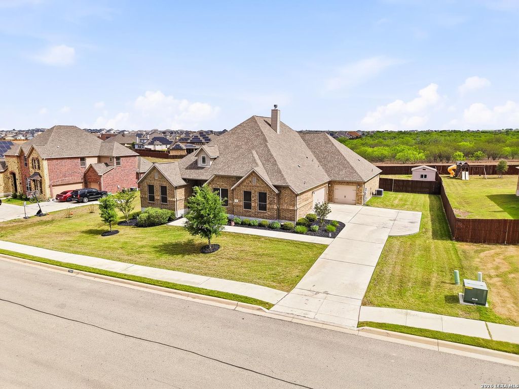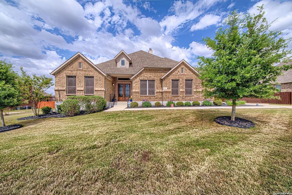 A prestigious one-level luxury home that has recently become available. Perched on a hill and situated on a little over a half-acre, this property has been meticulously maintained and features significant high-quality upgrades throughout. The home welcomes you with high ceilings, a dome foyer, and stunning arches. Notable interior features include: - Premium Flooring: Porcelain tile throughout the entrance, great room, kitchen, half-bath, dining area, laundry room, and primary suite bathroom. - Gourmet Kitchen: Equipped with a double oven, maple wood cabinets, granite countertops, a propane cooktop, and a vent hood with a travertine herringbone pattern tile. - Primary Suite: A luxurious retreat featuring a tray ceiling, custom drapery, dual separate vanities, dual walk-in closets, a walk-through shower, and a garden tub. - Living & Entertainment: An open-concept family room with six faux-wood ceiling beams and a 10-foot stone fireplace,