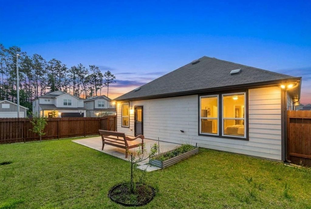 Immaculate Centex-built home showcasing a thoughtfully designed open-concept layout with 4 bedrooms and a smart split-bedroom arrangement, ideally positioned on a spacious corner lot. Attractive vinyl plank flooring enhances the main living areas, creating a seamless and modern flow. A stunning, professionally landscaped garden graces the side of the home, offering a luxurious outdoor retreat with curated greenery, inviting perennials, and a serene setting perfect for relaxation. The front bedroom provides flexibility as a private home office or guest suite. A distinctive layout places the kitchen at the front, featuring granite countertops and effortless flow into expansive living and dining areas. The secluded Owner’s Suite at the rear ensures privacy, complete with dual sinks, soaking tub, and separate shower. Located in Pine Grove, enjoy a peaceful wooded setting with convenient access to I-45, Hardy Toll Road, parks, trails, and recreation.