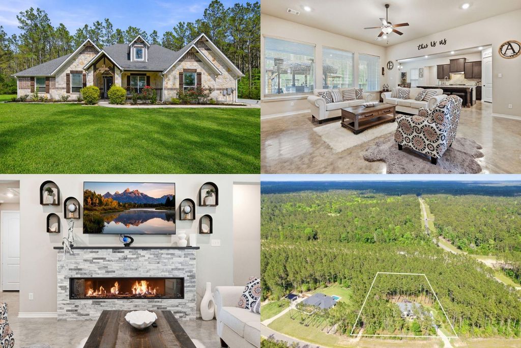 This peaceful retreat is beautifully set on 1.5 acres, positioned for total backyard privacy, relaxation, and entertaining. Inside, the open floor plan highlights a stunning fireplace as the focal point of the living area, flowing into a well-appointed chef’s kitchen featuring rich wood cabinetry, a 9’x5’ granite island with breakfast bar, 5-burner gas range, double ovens, and a large walk-in pantry. The primary suite offers an ensuite bath with dual vanities, garden tub, and double-sided walk-in shower. Additional sequestered bedrooms and a study provide flexibility for family, guests, or a home office. The expansive covered patio with stamped concrete creates the perfect setting for the tiki hut with outdoor kitchen with grill, wine cooler, mini refrigerator, and sink. Relax under the adjoining pergola while enjoying the garden greenhouse, serene forest backdrop, and abundant wildlife. Conveniently located near The Woodlands and Lake Conroe for fabulous amenities. All this and more!
