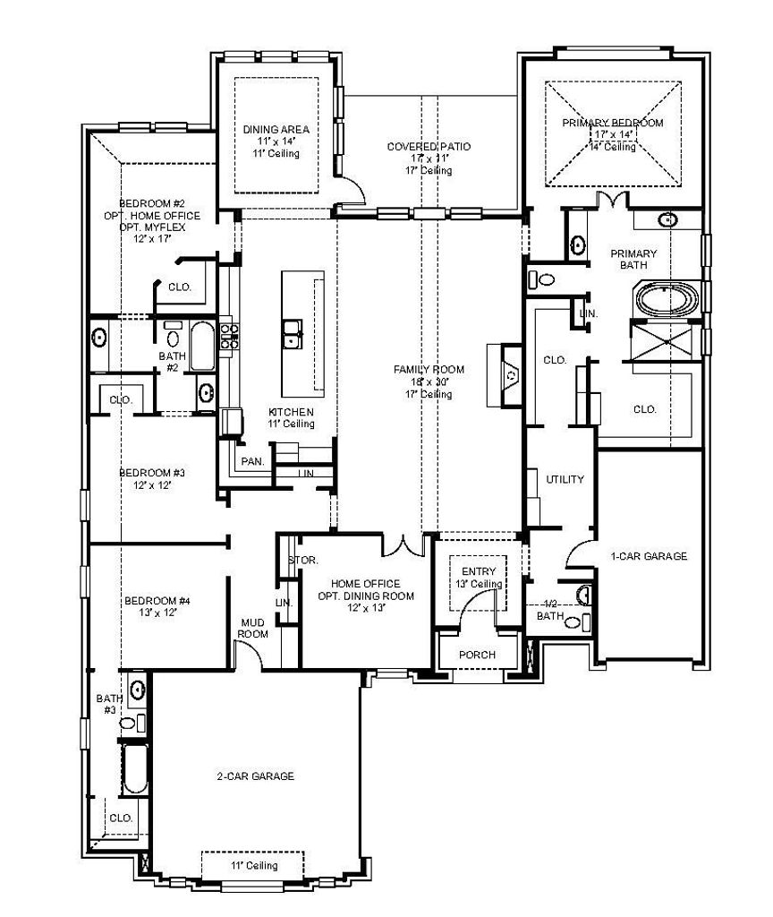 Entryway opens into the large family room which boasts a wood mantel fireplace, hardwood floors throughout main living area, and sliding glass doors. French doors lead into the home office with storage space. The kitchen features an island with built-in seating, a double wall oven, a 6-burner commercial style gas range top, and a walk-in pantry. The connecting dining area boasts two walls of windows and access to the backyard covered patio. The primary bedroom boasts a large picture window overlooking the backyard space. Double doors lead into the primary bathroom which features dual vanities, a freestanding tub, glass enclosed shower, two walk-in closets, and dual access to the utility room. Additional secondary bedrooms, ample storage, and a Hollywood bathroom complete the floor plan. The mud room is off the three-car split garage.