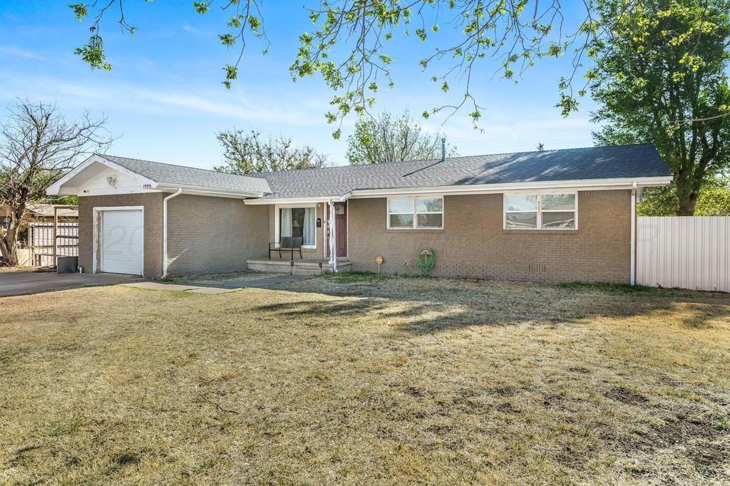 Corner lot brick home featuring an open floor plan and a one-car attached garage. The updated kitchen offers newer cabinetry and granite countertops in the kitchen and both bathrooms. Beautiful tile flooring flows through the main living areas, with carpet in the bedrooms for added comfort. The hallway bathroom features a relaxing spa tub. The backyard includes a dog run, newer metal fence, covered patio, and storage building--perfect for outdoor living and extra space. Home also features a 2024 Class 4 roof for added durability and potential insurance savings.