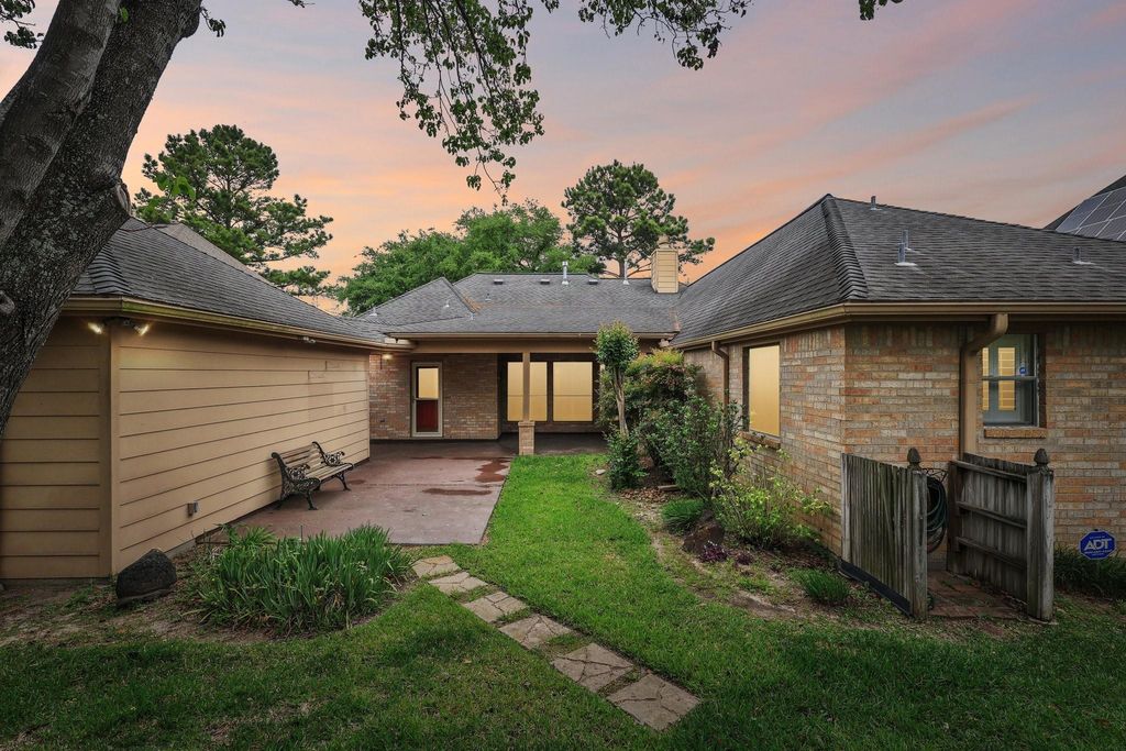 Tucked inside the gated Copper Grove community, this single-story home sits on one of the larger lots in the neighborhood, shaded by gorgeous mature trees that give it real curb appeal and privacy. Formal living and dining rooms feature plantation shutters, and the eat-in kitchen flows easily into a casual breakfast nook. The backyard is genuinely one of the best features here — a covered patio and open-air concrete extension give you flexibility to enjoy the outdoor space in any weather, backed by a landscaped yard with an in-ground sprinkler system. The home features storm doors in both the front and back, sunscreens, a detached garage, and a generous driveway. Zoned to Cy-Fair ISD with easy access to the Lou Mautz Greenway, US-290, and Hwy 6 — community amenities include walking trails, tennis courts, and a pool.