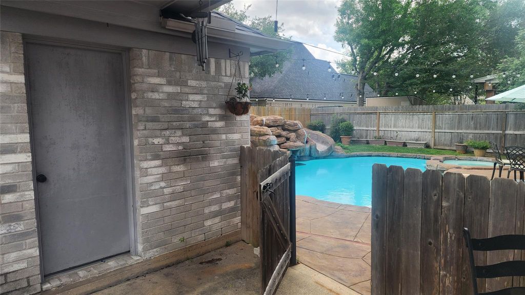 Inside has the preferred floorplan of Primary bedroom and a secondary bedroom downstairs. Outside is an oversized garage next to a perfect size pool. An acceptable offer will get a decorator allowance enough to upgrade with new carpet, paint and perhaps some fixtures in the style you would choose. Home is 1/2 block from a pocket park.