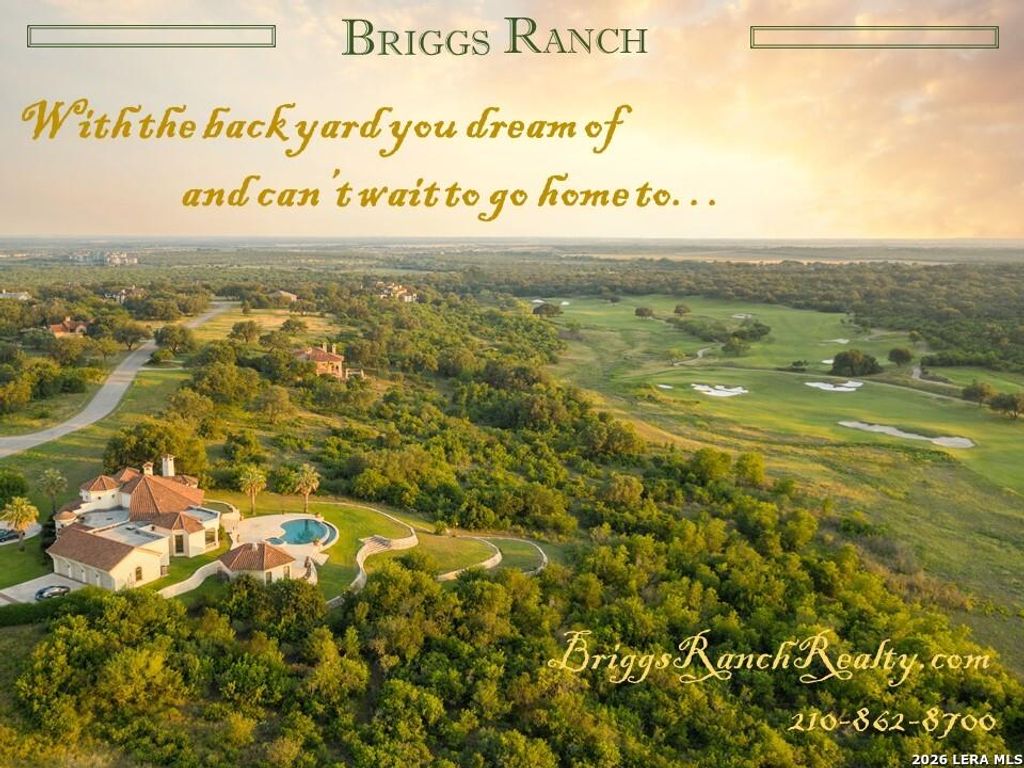 Nestled on Rustlers Trail, this estate lot immerses you in the beauty of The Trails of Briggs Ranch, offering sweeping views of the 11th fairway and three additional golf holes within this coveted, gated, and deed-restricted community. Set atop a gently rolling hillside in the picturesque Texas Hill Country, the property boasts a front-row seat to a championship golf course. Enjoy breathtaking sunsets from your own backyard, with panoramic views that paint the sky each evening. Briggs Ranch is less than 2 miles from HEB and a variety of retail stores, and fewer than 25 miles from the famous Riverwalk and San Antonio International Airport. Residents enjoy access to a private clubhouse, swimming pool, and miles of scenic walking trails, all within the secure gates of this exclusive community.