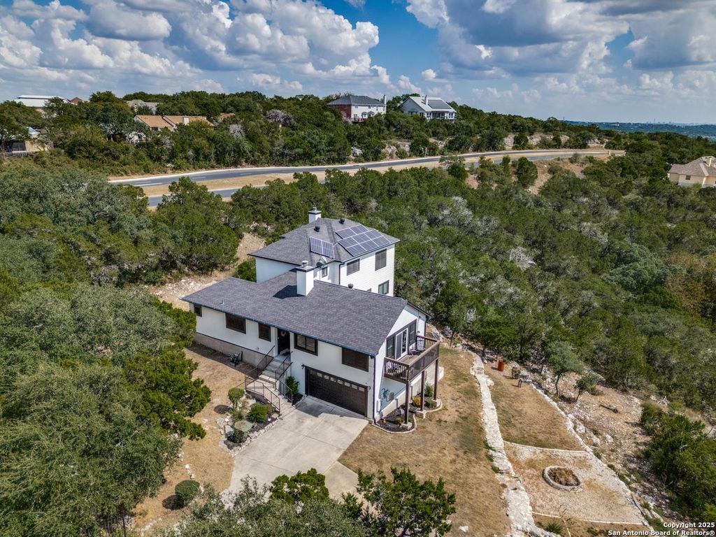 Welcome to paradise! Your dream home in the hills of Helotes is here! No HOA, 5 acres of gorgeous views and beautiful sunrises/sunsets. Fully updated home with views from every room. 3 bedroom, 2 bath home with an office! Fully paid solar panels will remain with the home-- extremely low utility payments! Home also includes a water system, hot tub, and endless views of hill country.