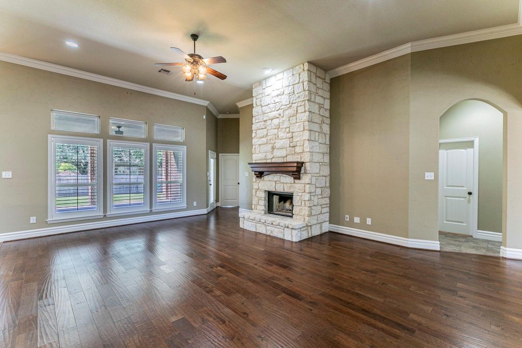 Welcome to 112 Star Ridge Circle in Stone Creek Ranch—tucked away on a quiet cul-de-sac and ready for your family to enjoy! This beautifully laid-out 4-bedroom, 4-bath home offers the perfect balance of comfort, space, and functionality. Inside, you’ll find a warm, inviting layout featuring plantation shutters throughout, a formal dining space ideal for hosting, and a spacious living room centered around a striking Austin stone floor-to-ceiling fireplace. The home truly shines with its flexible spaces. A large game room or bonus area—complete with built-in theater audio—creates the perfect spot for movie nights or entertaining, while a tucked-away office provides a quiet space for work or study. Two generously sized bedrooms with their own bathrooms sit beyond this area, creating an ideal setup for kids or guests. The kitchen is both stylish and practical, featuring granite countertops, stainless steel appliances, and plenty of room to gather. The isolated primary suite offers a true retreat with a spa-like bathroom, including a walk-in shower, whirlpool tub, and an oversized walk-in closet. Thoughtful details continue throughout, including a functional laundry room with built-in mudroom space, a massive three-car garage, and an extended driveway with room for multiple drivers. Step outside and you’ll find a massive backyard due to its position on the cul-de-sac that is perfect for outdoor play and entertaining. The backyard is complete with a covered patio, built-in grill, and mounted TV that is ready for year-round enjoyment. From its smart layout to its standout features, this home checks all the boxes in a location you’ll love.