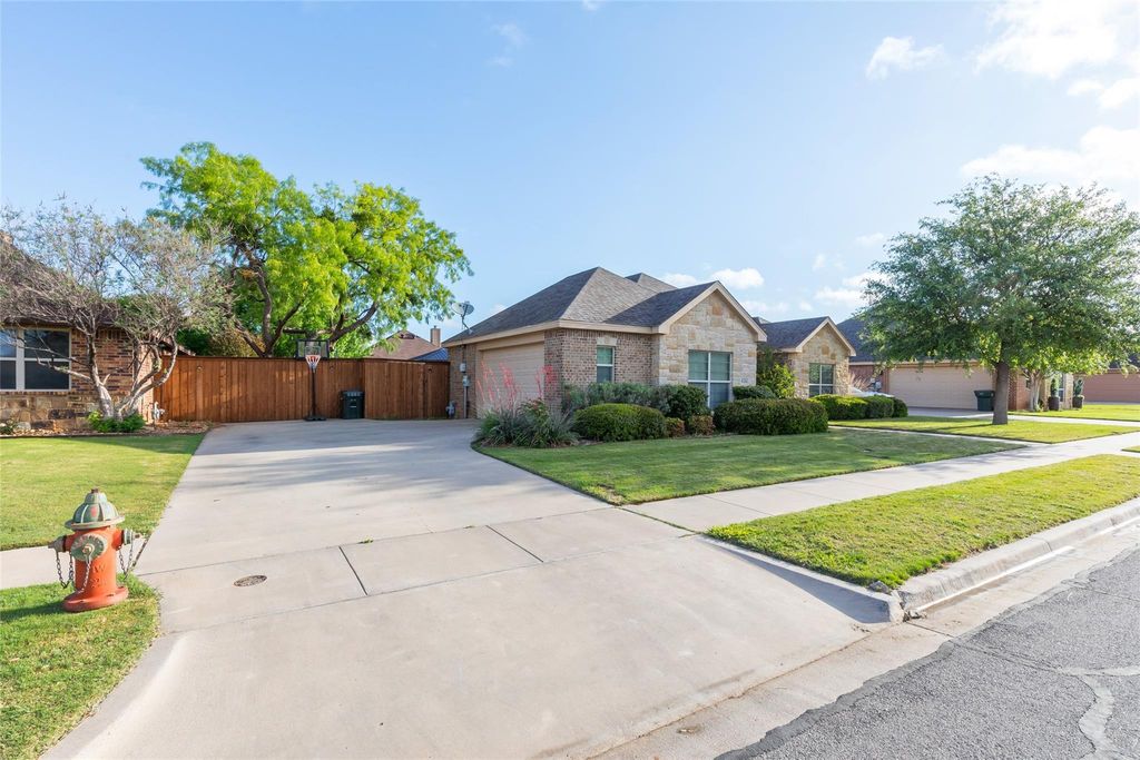 Welcome to desirable Lone Star Ranch, where comfort and convenience come together in this beautifully designed 3-bedroom, 2-bath home with an open floorplan perfect for everyday living and entertaining. The spacious living room features a tall vaulted ceiling and a stunning stone wood-burning fireplace, creating a warm and inviting focal point. The kitchen is well-appointed with stainless steel appliances, quality cabinetry, and a large island with seating for four—ideal for gathering with family and friends. The oversized primary suite offers plenty of space to unwind, complete with an ensuite featuring a corner garden tub, dual sinks, a walk-in tiled shower, and a generous walk-in closet. Guest bedrooms and the secondary bathroom are also nicely sized, providing comfort for everyone. Step outside to enjoy the covered back patio and cabana, equipped with a built-in grill, countertop-bar space, a mini fridge and hot tub—perfect for outdoor entertaining. The patio has been extended to allow for even more space to host gatherings. Recent updates include a Jacuzzi hot tub, cabana, outdoor kitchen refrigerator, dishwasher, a new roof, and updated sprinkler heads and drip irrigation in the flower beds with a Rain Bird controller. Conveniently located with easy access to Dyess AFB, schools, and shopping, residents of Lone Star Ranch enjoy access to a community clubhouse featuring two pools, a covered picnic area, hot tub, and restrooms.