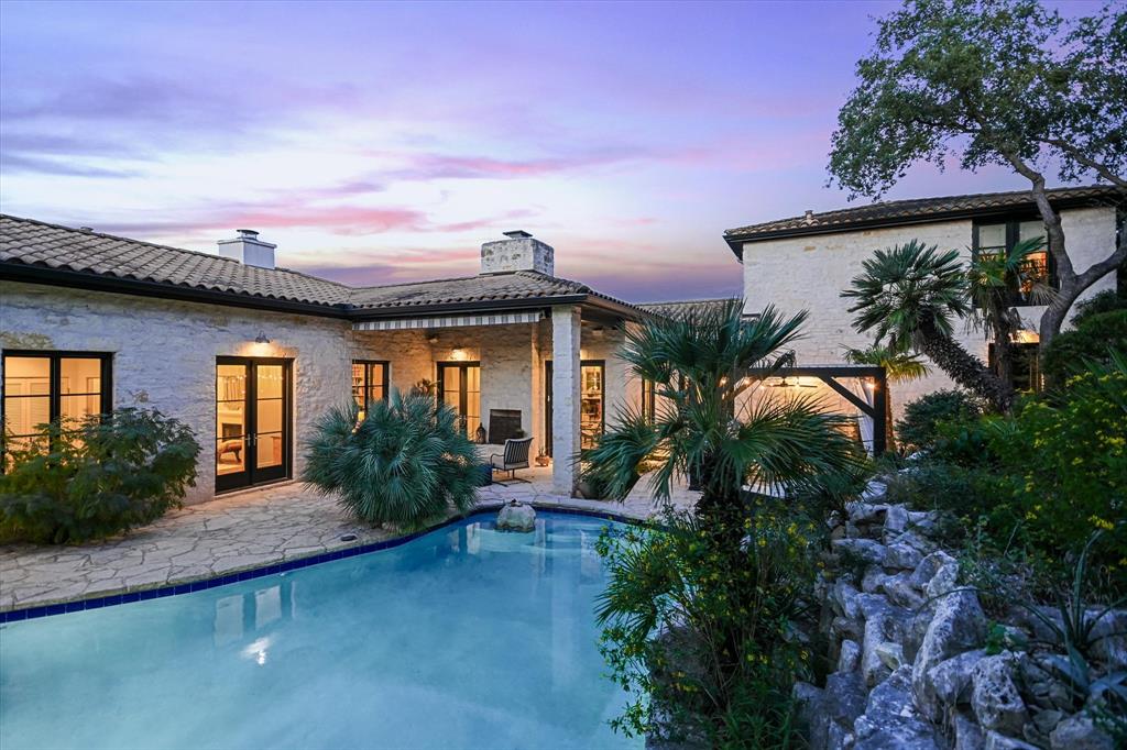 Tucked within scenic West Lake Hills, this French country-inspired residence offers a stunning balance of old-world charm and modern livability. The home rests on nearly two acres of lush, native landscape, creating a peaceful sense of seclusion just minutes from the heart of Austin. At Windsong Trail, timeless architecture and thoughtful enhancements come together in a setting that feels both private and inviting. Character defines the interiors, where large windows, high wood vaulted ceilings, Saltillo floors, and French doors bring in abundant light. The upgraded kitchen boasts high-end appliances, a center island, and immaculate finishes with plenty of prep space and a well-appointed breakfast nook. Enjoy dining in the beautifully converted sunroom, then relax in the quiet den with built-in shelving and a fireplace. The main-level primary suite is a private retreat with a fireplace, exquisite marble accents, and a luxurious soaking tub. A detached guest apartment with a private entrance adds versatility for visitors or extended stays. Outdoors, the property is a secluded oasis with meandering pathways surrounded by the curated natural landscape with various seating areas designed that showcase the views. A pergola and outdoor kitchen are ideal for dining by the resort-style pool. This exceptional retreat in Eanes ISD offers privacy, beauty, and effortless access to the city. Tax and assessed values are estimates for illustration purposes only. All figures should be independently verified.