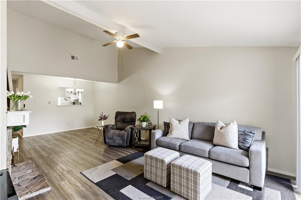 Adorable 2-bedroom, 2-bath townhome in the heart of College Station! This charming home features raised ceilings and abundant natural light throughout, creating a bright and airy feel. The kitchen has plenty of cabinets for storage and a pantry. A dining area and spacious living room, complete with a cozy stone gas fireplace with glass sliding doors to the backyard area. Enjoy outdoor living with a private fenced patio, plus an additional secluded patio just off the primary bedroom-perfect for morning coffee or evening relaxation. An attached 1-car garage adds convenience and extra storage. Centrally located and close to shopping, dining, and everyday conveniences. Best of all-NO HOA!