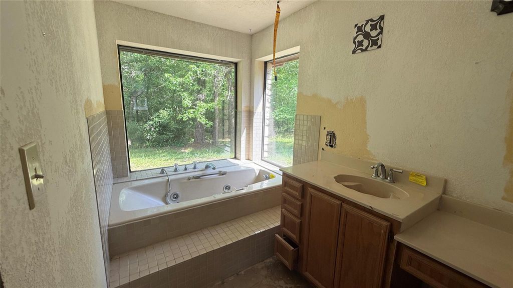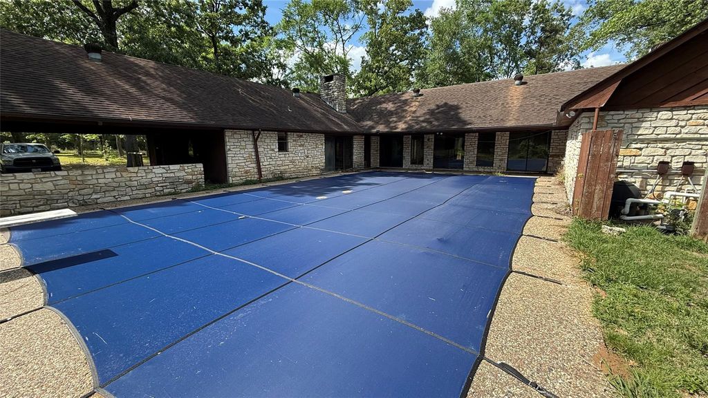 One-story home with 3 bedrooms (2 en suite), and 4 bathrooms on 5 partially wooded acres, close to Lake Livingston. Property includes a storage building and an in-ground pool visible from multiple areas—ideal for relaxing or entertaining. Interior features soaring ceilings, a floor-to-ceiling wood-burning fireplace, spacious bedrooms, and four full baths, with flexible space for customization. A separate listing has an additional 5 acres that wrap around three sides. MLS 84102602