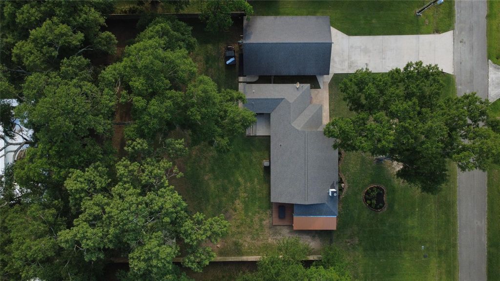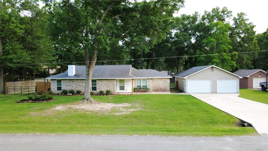 A rare and beautiful home in the desirable City of Woodbranch! This home features two primary bedrooms with private baths, plus two additional bedrooms ideal for family, guests, or a home office. The spacious living room offers tall ceilings, abundant natural light, and a charming fireplace. Adjacent to the living room, the kitchen offers abundant cabinet and counter space with a recently upgraded sink and faucet. Other interior updates include fresh paint throughout the home and new bedroom flooring, along with a remodeled laundry area to make those chores just a little easier! Situated on a half-acre lot, the property includes a large detached garage that is insulated and climate-controlled making this the perfect work shop or place to store your toys! The fully fenced backyard provides privacy and space for pets or play, while the covered deck is perfect for outdoor entertaining. Fresh landscaping enhances curb appeal and adds dimension to the yard. Schedule your showing today!