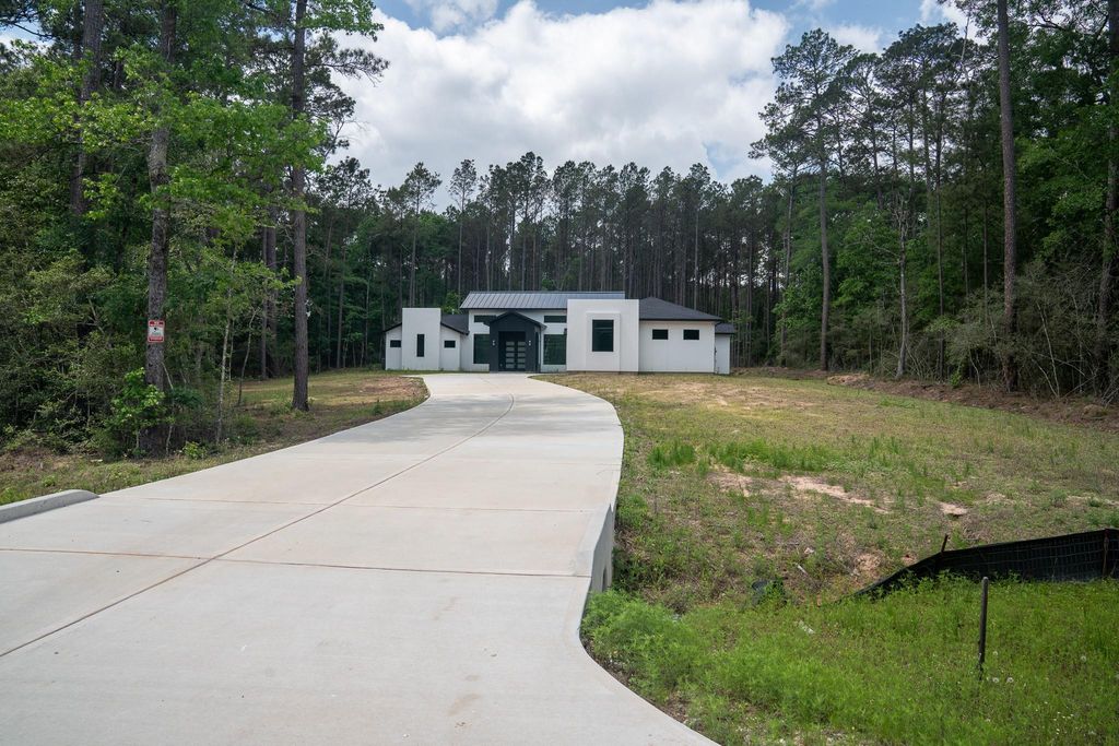 Beautifully designed one-story home situated on a 2-acre wooded lot in the Texas Grand Ranch community. Features 3 bedrooms, 4 bathrooms, and a 3-car oversized garage. The home boasts 17-foot ceiling heights in the living, dining, and kitchen areas, 12-foot ceilings in the primary bedroom, and 10-foot ceilings throughout. Soaring windows provide ample natural light. The flex room features a glass door leading to a covered porch, enhancing indoor-outdoor living. The extended driveway and oversized garage offer plenty of parking space. The property is being sold strictly "AS-IS." Construction is approximately 95% complete. The price is below market value to allow buyers to complete the home to their specifications.