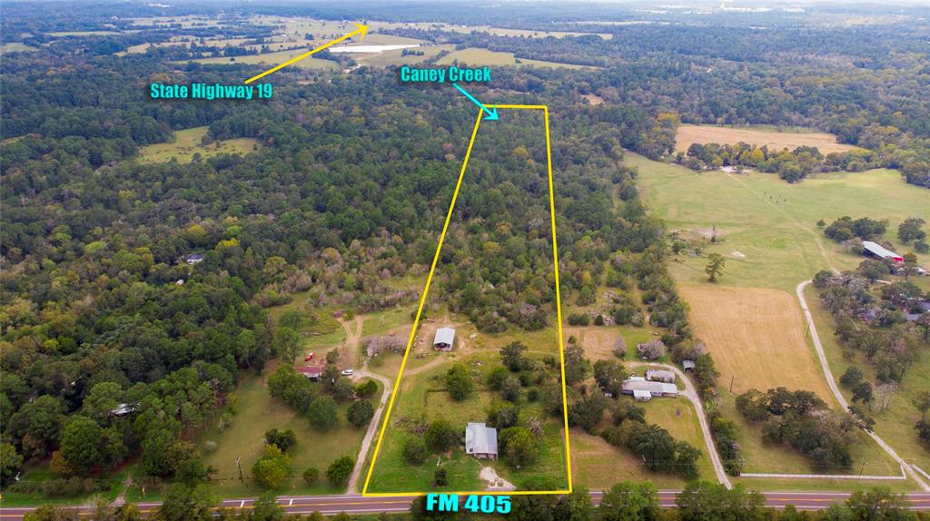 Situated on nearly 15 acres of unrestricted land, this property offers approximately 230 feet of road frontage to FM 405, just 1 mile from Hwy 19 and 16 miles from I-45. With a mix of tree coverage and open spaces, all backing up to Caney Creek, the possibilities are endless. A 1500 SF pole barn with a concrete slab adds storage or outdoor entertaining options. The existing home is a tear down with unknown utility conditions. Imagine the potential this land holds for your future vision.