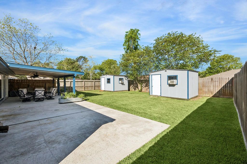 Great home in Wedgewood Village! Did NOT flood in Harvey! Many updates: Roof replaced 2021; water heater 2023; replaced garage door with an insulated garage door and opener 2021; foundation repaired 2012 with lifetime warranty; fence 2021; all soffits 2021; partial siding and trim 2021; A/C and ducts replaced 2024; chimney sweep service 2021. Whole-house Rainsoft water softener with an under-the-sink reverse osmosis system for drinking water. The home is wired for a portable generator with a manual transfer breaker; wiring will stay, but the generator is excluded unless negotiated. Two large sheds stay with the property. Large covered patio. All room sizes are approximate; please independently verify.