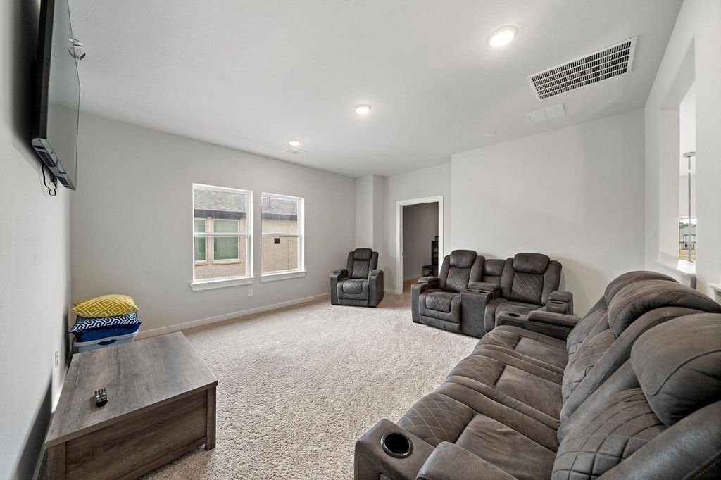 Welcome to this beautifully designed 2022-built residence offering 3,220 sq ft of thoughtfully crafted living space on a 7,394 sq ft premium lake-view lot. This spacious two-story home features soaring double-height ceilings and an elegant spiral staircase that makes a bold architectural statement the moment you enter. The home offers 4 generously sized bedrooms, 3.5 bathrooms, a private office, a game room, and a dedicated movie theater, perfect for both entertaining and everyday comfort. The open layout is filled with natural light and designed for modern living. Enjoy outdoor relaxation on the covered patio while taking in tranquil lake views. Additional upgrades include a sprinkler system, gutters, and a garage door motor, adding convenience and value. This home combines luxury, functionality, and location — ideal for families, professionals, and entertainers alike. ? A rare opportunity to own a premium lake-view home with modern elegance and space to match.