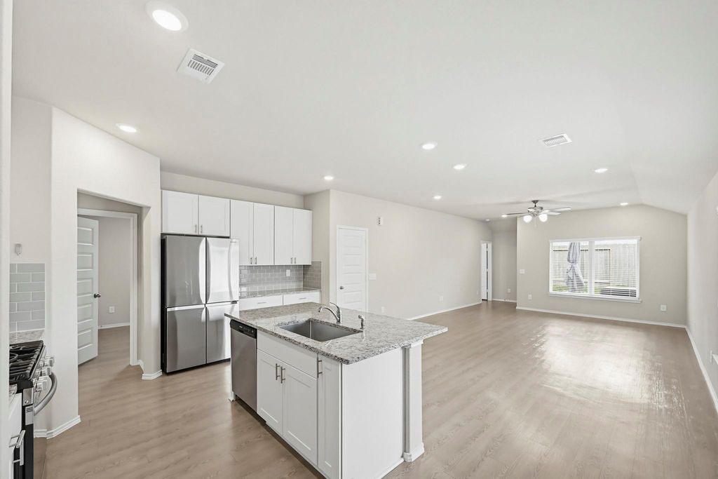 Welcome home to your turnkey, move-in ready, nearly brand-new home! Built in 2024, this single-story has 3 bedrooms, 2 baths with modern finishes and everyday comfort at an excellent price. Enjoy no carpet throughout the home and faux wood blinds for a clean and low-maintenance feel. The open-concept layout features a bright kitchen with granite counters, kitchen island, breakfast bar, subway tile backsplash, gas range, stainless steel appliances, white cabinets, and recessed lighting. The private primary suite is tucked away at the back of the home for peace and privacy. The en-suite features a Silestone quartz vanity and a spacious walk-in closet. Additional highlights include a 2-car attached garage, in-home utility room, gutters, and a covered patio for outdoor relaxation. This home offers an easy commute with quick access to Hardy Toll Road and I-45. Schedule your showing today!