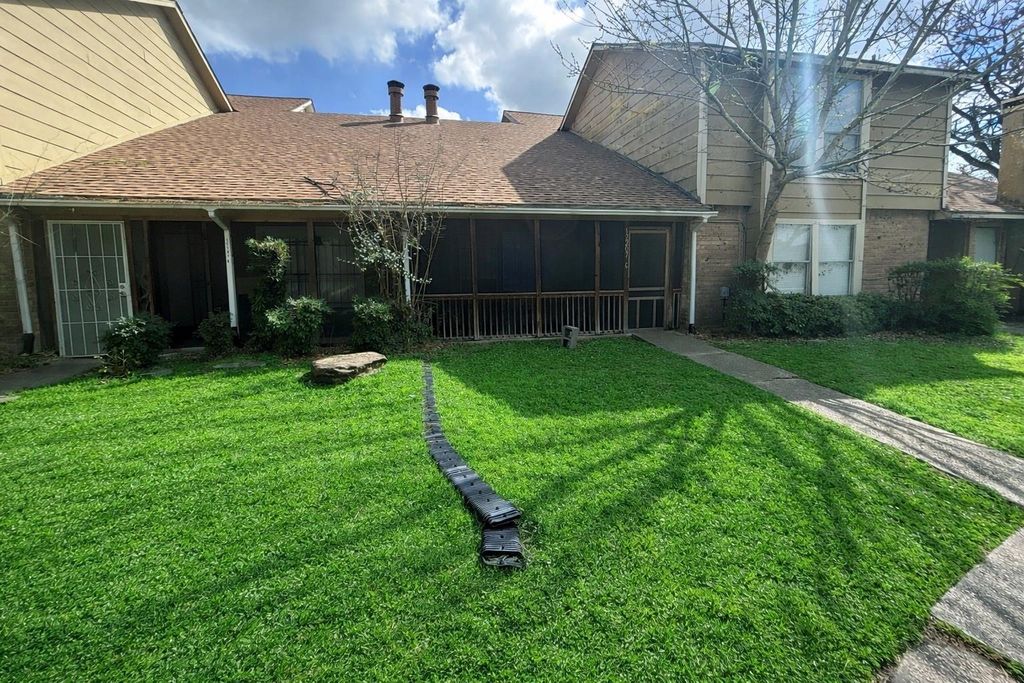 This two-story townhouse in the established Pine Village North community features a classic brick and siding exterior complemented by a mature green lawn and private concrete walkways. The functional layout offers 3–4 bedrooms and 2.5 bathrooms, providing ample space for living and storage. Enjoy outdoor areas including a spacious, ground-floor screened-in porch and an additional upper-level deck. The property includes a secure screened entry and a composition shingle roof. Conveniently located near I-69 and IAH Airport, this home provides easy access to major Houston thoroughfares.