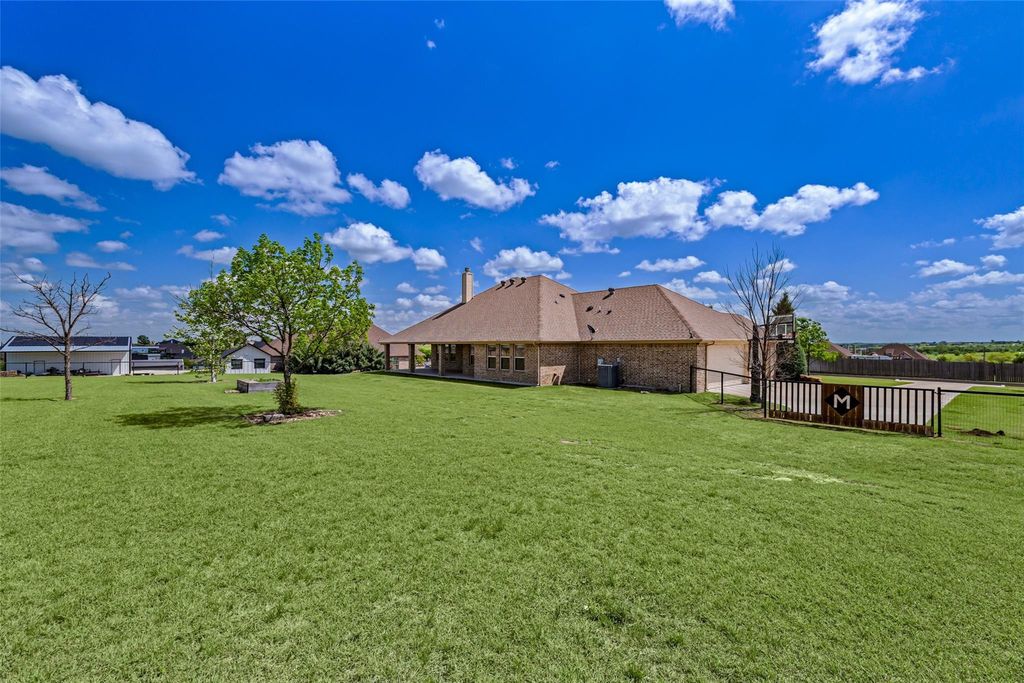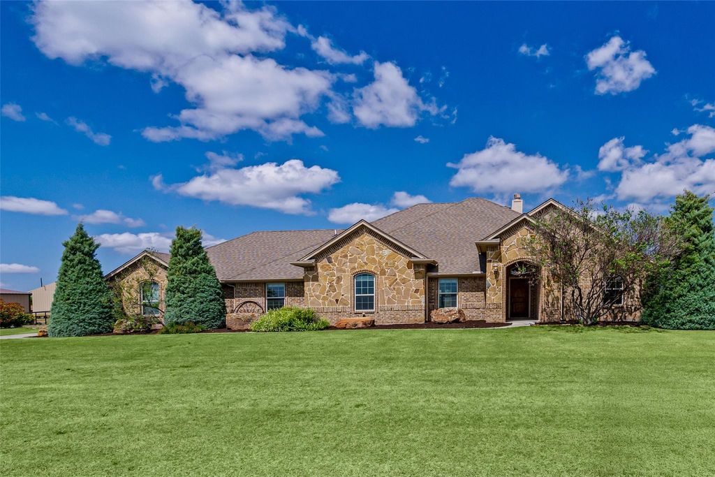 Beautiful custom home situated on a premium 1.07-acre lot in the desirable Aledo area, offering stunning sunset views and peaceful surroundings. Built in 2015, this 4-bedroom, 2.5-bath home features 2,571 square feet of thoughtfully designed living space. The open-concept layout includes a spacious living area with a wood-burning fireplace (never used), flowing seamlessly into the kitchen and dining areas—ideal for entertaining. The kitchen is equipped with an induction cooktop, reverse osmosis water system, and a large walk-in pantry. The private primary suite offers a spa-like bathroom with upgraded rock flooring, dual shower heads, and additional built-in shelving in both showers. Three secondary bedrooms each include walk-in closets. Additional highlights include a playroom-den, extended patio perfect for enjoying Texas sunsets, fenced backyard, and a 3-car garage with built-in cabinetry. Seller is a Licensed Real Estate Agent. Property is serviced by a shared community well. It is also serviced by Tri-County Electric, contributing to low utility costs. No HOA.