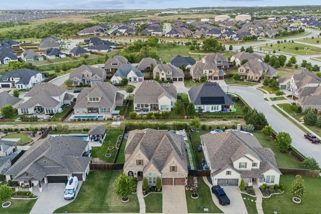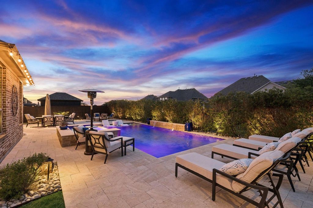 Welcome to your own private resort-style backyard in Canyon Falls—designed for relaxation & unforgettable entertaining. Located walking distance to both Argyle South Elementary & High, this exceptional home backs to a greenbelt easement for added privacy. Featuring a luxurious pool with tanning ledge, sheer descent waterfalls, spa, and expansive travertine decking, this home was built for serious entertainers. Guests and homeowners alike will enjoy the custom natural gas fire table and outdoor kitchen with grill and bar seating all flanked by an outdoor Sonos 6-speaker system with in-ground subwoofer. Expertly designed landscaping and uplighting enhance both front and back yards, showcasing the entire home in perfection. Inside features refined finishes with wood flooring throughout. Main living room is anchored by a floor-to-ceiling stone fireplace, framed by a beamed & vaulted ceiling and Juliet balcony overlook from the second level. First floor also features a private office with built-ins and formal dining with passthrough to kitchen. Kitchen impresses with quartz countertops, apron-front sink, wood vent hood with spice pulls, gas cooktop, double ovens, and a large island with turned legs and pendant lighting. A walk-in pantry with ELFA system, butler’s pantry, and breakfast nook with built-in buffet station continue to add both function and style to this secondary dining space. Primary suite offers serene retreat with backyard views and spa-inspired bath featuring dual vanities, a dedicated sit-down vanity, soaking tub, walk-in shower and expansive custom closet system from Closets by Design. A secluded first-floor guest suite features a beautifully updated bath with walk-in shower. Upstairs offers two spacious secondary bedrooms, sharing a Jack & Jill bath, game room & pre-wired media room. Lastly, home boasts 3-car garage with epoxy flooring! HOA includes: front yard care, internet, cable, pools, splash pads, Gym, playgrounds, fishing, dog park & trails.