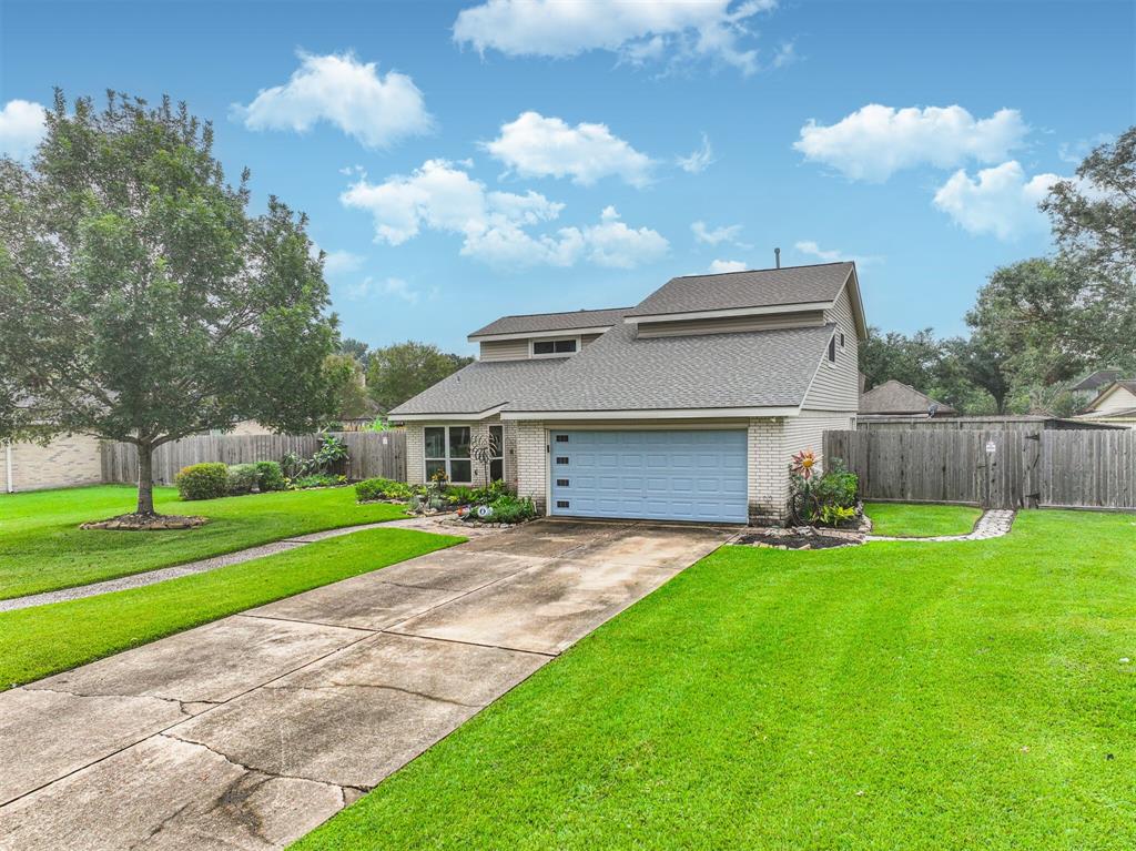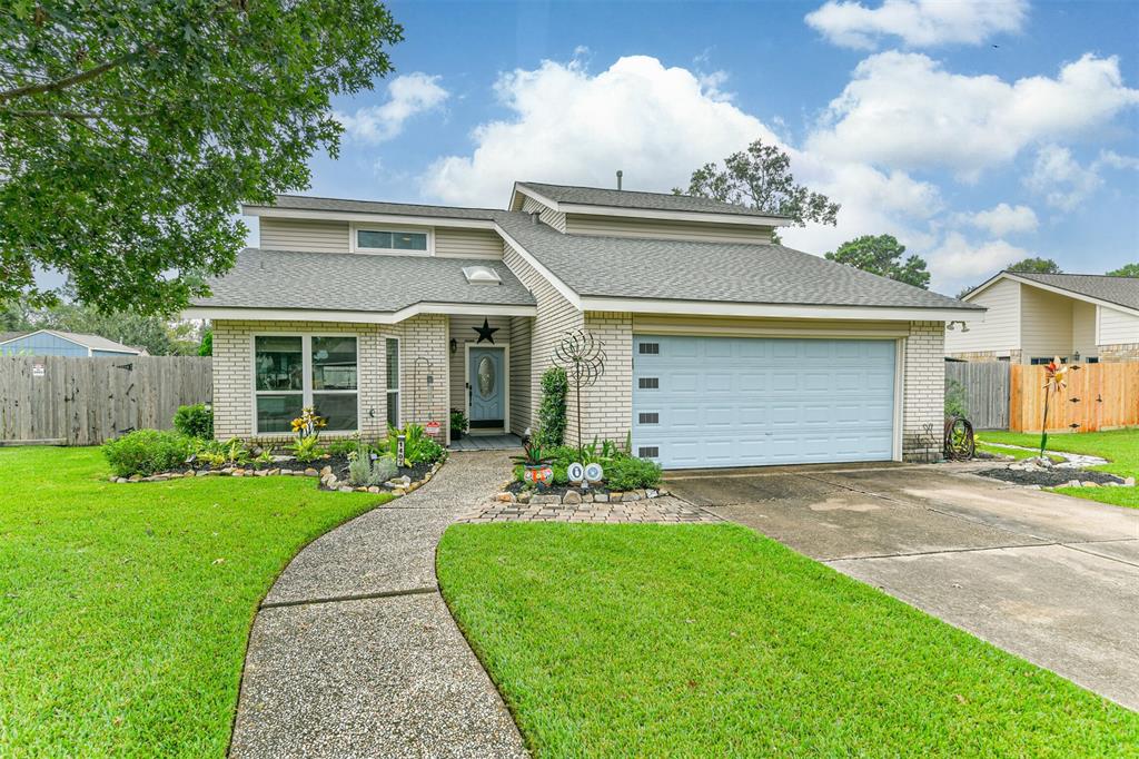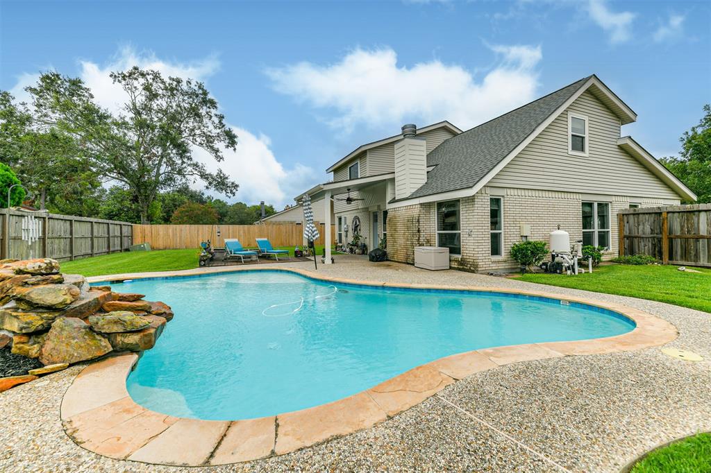 Welcome to this stunning immaculate updated home in established Friendswood neighborhood on an oversized lot with a covered patio and refreshing pool. The island kitchen features silestone counters, subway tile backsplash, soft close custom cabinetry, and updated appliances. Enjoy the open concept living room with high ceilings, gas log fireplace, and beautiful wood/tile flooring through out the first floor. The primary suite boasts a renovated bath with dual sinks and silestone counters. Secondary bedrooms upstairs with ample closet space and floored attic area. Step outside to relax on the covered patio or take a dip in the inground sports pool with waterfall. Recent roof, patio cover, fencing, & paint. Other upgrades, windows, lighting fixtures, faucets, bath surround. Backyard storage shed. Conveniently located near shopping, restaurants, and easy access to 528/I-45. Don't miss out on this fantastic opportunity! Never Flooded!