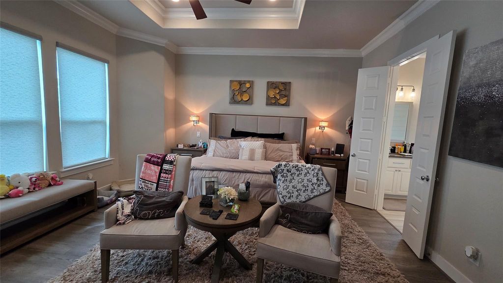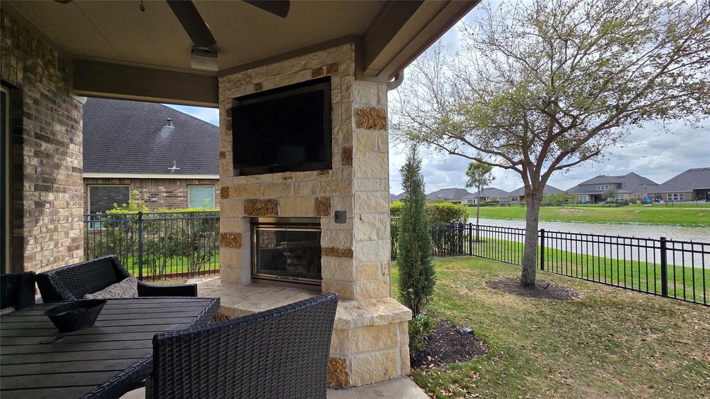 Stunning lake views set the tone for this beautifully designed 3 bed, 2 bath home, where water and light are part of everyday living. The formal entry welcomes you with tray ceilings and leads to a spacious private office. The living room features dramatic 15-foot vaulted ceilings and a gas fireplace, perfectly positioned to showcase the lake and open to the island kitchen, ideal for entertaining while enjoying the view. Just off the kitchen is a convenient wet bar and laundry room. The primary suite is privately tucked away with peaceful lake views, tray ceilings with decorative beams, and a serene feel. Outdoor living shines with a lakefront seating area featuring a gas fireplace, TV, and unobstructed water views, perfect for sunsets, gatherings, or quiet mornings by the lake. Designed to capture the beauty of the water from multiple vantage points, this home offers a rare blend of comfort and unforgettable scenery. Enjoy access to community trails, parks, and lake amenities.