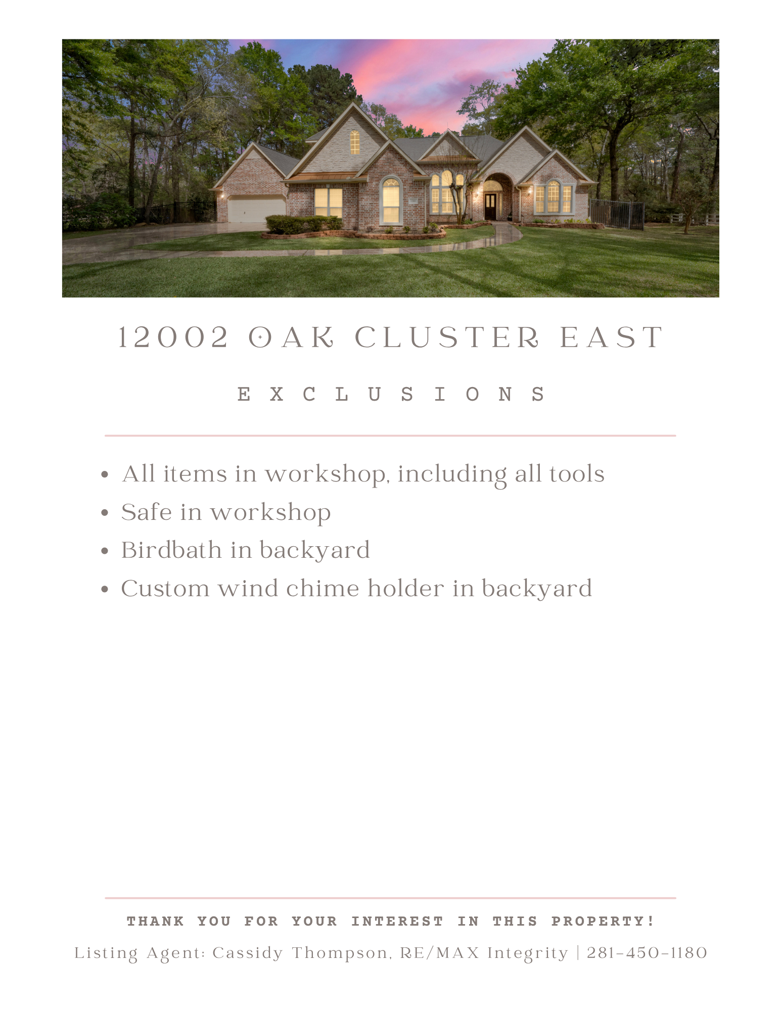 12002 Oak Cluster E is listed for sale at $ 644,900. The Single-Family property has 3 to 4 bedrooms, 3 Full Bathrooms, 1 Half Bathroom, 2736 square feet and was built in 2006. The lot size is 1.18 Acres. ##BR##Private cul-de-sac retreat on over an acre in a gated community-featuring a climate-controlled workshop, a standout feature offering endless possibilities! This 3/4 bdrm, 3.5-bath home offers a spacious, flexible layout with high ceilings, abundant natural light, and an open living area flowing into a kitchen with granite countertops, wine fridge, and ample cabinet space. Formal dining and a study with custom built-ins add function and charm. The primary suite is privately situated, while two secondary bedrooms are on the opposite side, creating a true split floor plan. Upstairs, a large game room with full bath and closet offers the option for a 4th bedroom. The oversized, wooded lot provides room to roam, plus the climate-controlled workshop with wall-mounted mini-split-ideal for a gym, hobby space, or future conversion. Enjoy neighborhood amenities including a private lake, pool, tennis and bball courts, playground, and pavilion, all in a peaceful, established setting.