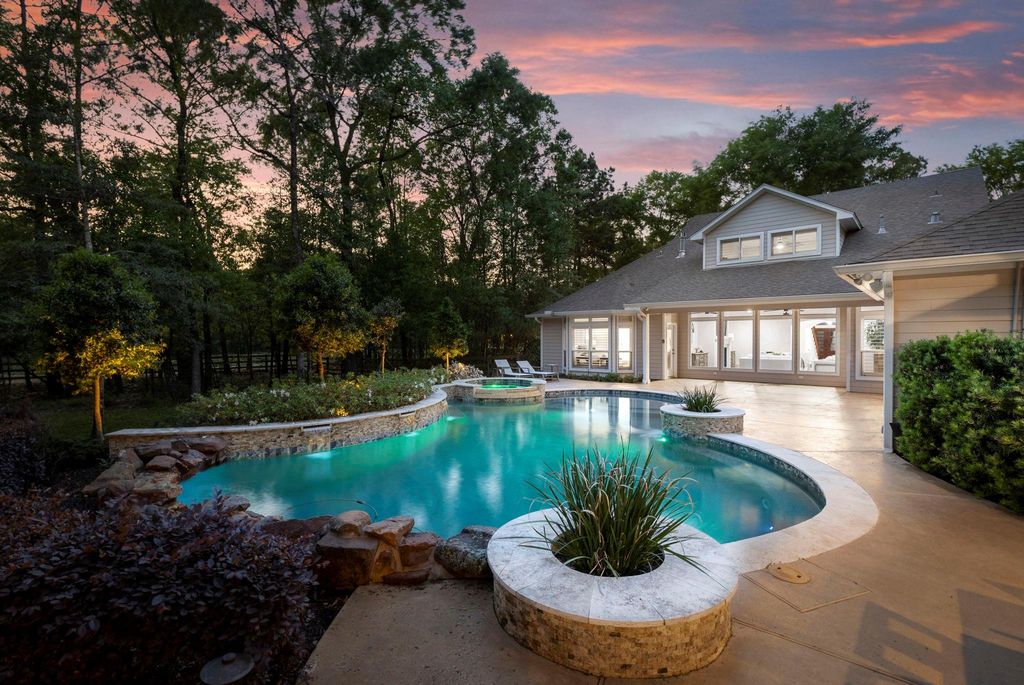Nestled on nearly 2 acres, this exceptional property blends space, style, and luxury. The backyard is an entertainer's dream, featuring a stunning pool, water features, hot tub, outdoor kitchen, and cozy fireplace under the covered patio—perfect for gatherings or quiet evenings. Inside, a remodeled kitchen and primary bathroom shine, complemented by custom built-ins in the walk-in pantry, office, and primary closet. The garage boasts sleek epoxy flooring and custom cabinetry, combining function and style. The versatile floor plan includes a first-floor guest suite in a private wing for added comfort. A wall of windows in the main living area overlooks serene backyard views, creating a tranquil retreat. Bonus: a Cummins whole-home generator adds peace of mind. Located in an exclusive gated community on a private street, this property offers security and elevated living. Don’t miss your chance to call it home!