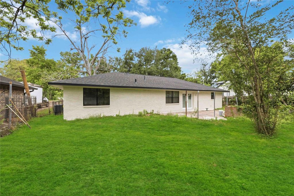 This fully remodeled single-story home offers a sophisticated blend of modern design and comfortable living. The exterior makes a striking first impression with its crisp white brick facade and black trim. Inside, the open-concept floor plan features recessed lighting and beautiful wide-plank flooring throughout. The gourmet kitchen serves as the heart of the residence, boasting sleek sage cabinetry, expansive marble-style quartz countertops with waterfall edges, and high-end stainless steel appliances. A large breakfast bar opens directly into the spacious living area, creating an ideal layout for entertaining. The primary bathroom is a spa-like retreat with a massive glass-enclosed walk-in shower and dual vanities with elegant gold hardware. This three-bedroom layout includes a versatile home office space and a sizable, lush backyard with mature trees. Situated in a growing Houston neighborhood, you are just minutes from local parks and a quick commute to downtown.