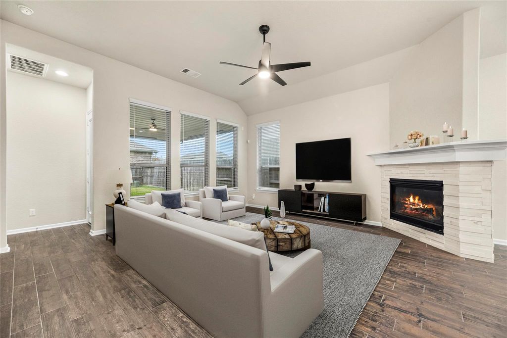 Looking for a 4-bedroom home in Sienna with a game room and home office? This beautiful Chesmar-built home in Missouri City offers 4 bedrooms, 3 full baths, and 2,680 sq. ft. of open living space. Enjoy fresh paint, new carpet, and wood-look tile floors throughout the first floor. The kitchen features quartz countertops, a large island, gas cooktop, and pendant lighting, all open to the living area with a cozy fireplace. The primary suite and a secondary bedroom with a full bath are conveniently located on the first floor, perfect for guests or multigenerational living. Upstairs, you’ll find a spacious game room and two additional bedrooms. Relax outdoors on the covered patio and fenced backyard. Located in Sienna, known for resort-style pools, parks, trails, tennis courts, and top-rated Fort Bend ISD schools, with easy access to Highway 6 and Fort Bend Tollway for a quick Houston commute.