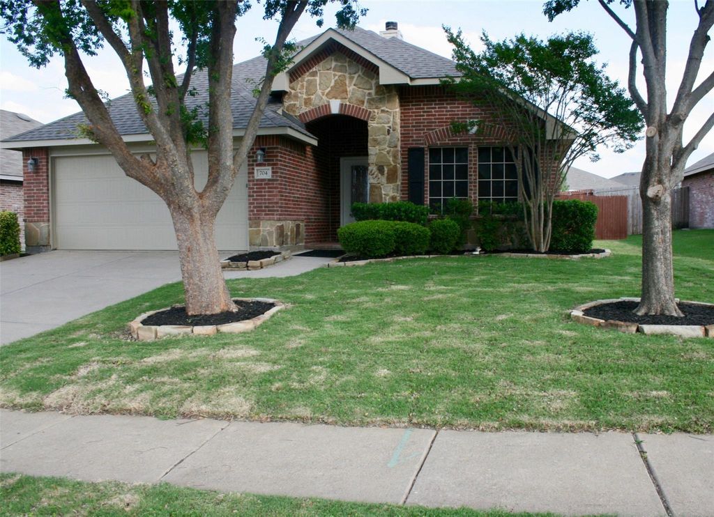 ATTRACTIVE HOME. Located in Spring Meadow Subdivision. FRESHLY PAINTED INTERIOR. FULLY BRICKED! HUGE BENEFIT - NO MUD OR PID FEES, common to other properties is this area. Open floor concept. Spacious eat-in Kitchen with granite counters, plenty of cabinets, a breakfast bar, and pantry. The Kitchen overlooks a 20’x16’ living room with a fireplace. All windows have blinds and solar screens. The Living Room and all Bedrooms have ceiling fans. The Primary Bedroom is a 16’x15’ with a 3’x5’ entry and is perfectly located on the back southeast corner of the home, includes a 12'x5' walk-in closet, ensuite bathroom with dual sinks, separate shower and bath. One Secondary Bedroom is down the hall from the Primary and the other is on the front NW corner allowing for some separation. Laundry Room conveniently located off the kitchen. 2 Car Garage is clean, newly painted, with an epoxy-coated floor. Covered 8’x6’ brick paver front porch and 10'x8' backyard patio. This home provides comfort with practicality. PLUSES: 1) NEW ARCHITECTURAL TYPE SHINGLES AUGUEST 2025. 2) Radian barrier roof decking with 12''+ attic insulation. 3) Survey available. 4) Conveniently located near schools, downtown Fate. 5) Community amenities include a playground and fishing pond. 6) IT CAN BE YOURS!