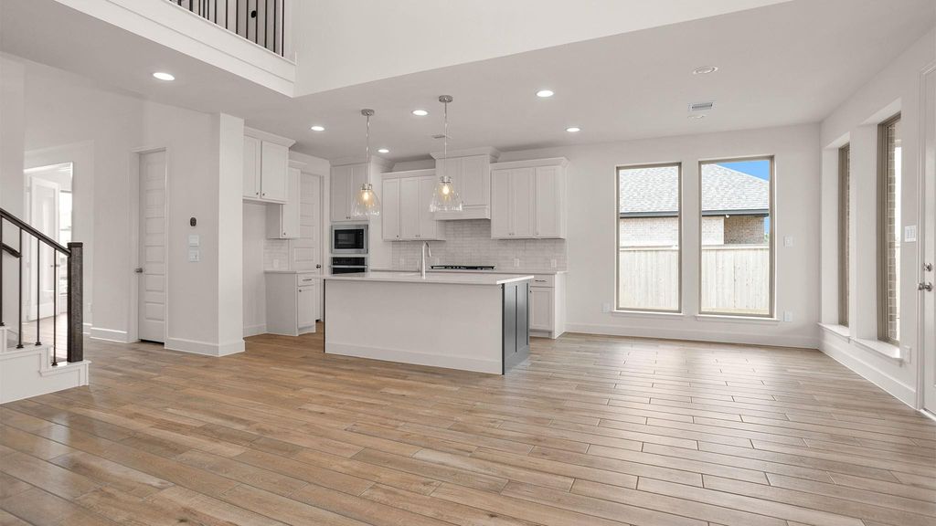 READY FOR MOVE-IN! Home office with French doors set at two-story entry. Two-story family room opens to kitchen and morning area. Kitchen features large walk-in pantry, a 5-burner gas cooktop and generous island with built-in seating space. Family room features wall of windows. First-floor primary suite includes bedroom with wall of windows. Dual sinks, garden tub, separate glass-enclosed shower and large walk-in closet in primary bath. Game room and all secondary bedrooms are upstairs. Extended covered backyard patio. Two-car garage with additional garage bay space.