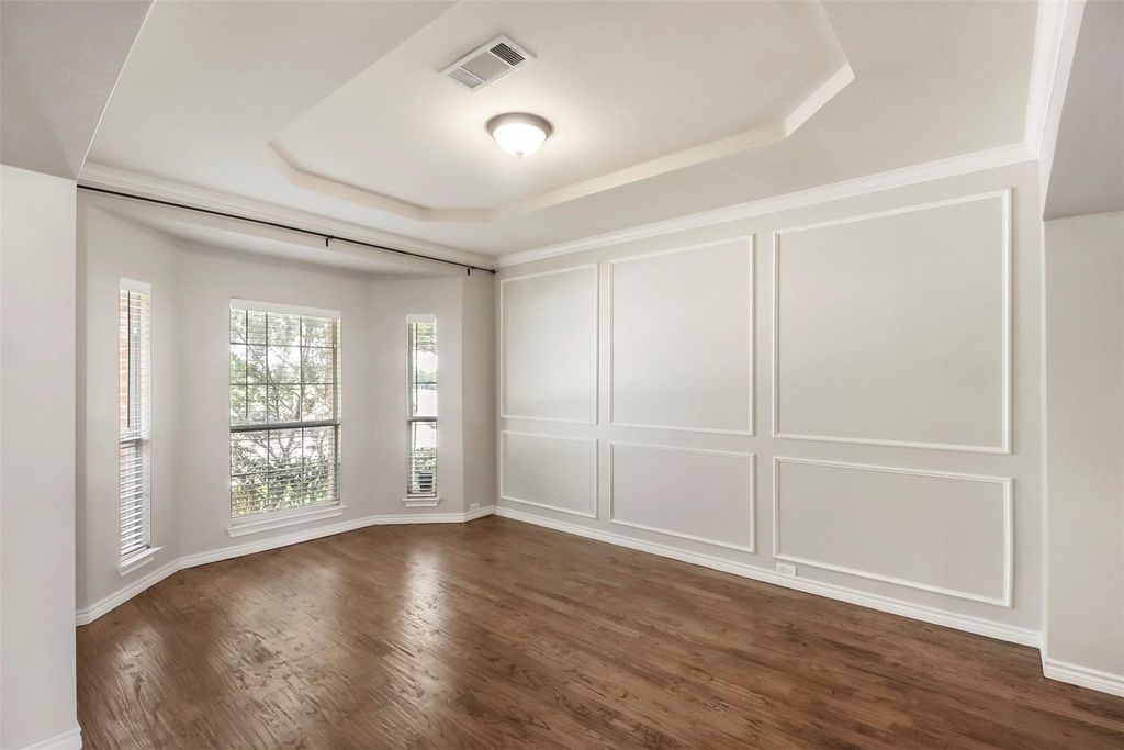 Gorgeous 5 beds 3.5 baths with office,media room and game room in the central Frisco.This home offers the perfect balance of comfort and convenience, with green open space across the front yard and high sought after Frisco schools. Step inside to discover a home where elegance meets functionality. The open and airy floor plan is bathed in natural light, setting an inviting tone throughout. The heart of the home features a high ceiling living area facing the cozy backyard and a stone fireplace, which isn't just a space to relax but a place where everyday moments turn into cherished memories. The adjacent gourmet kitchen with plenty of cabinets and an island, perfect for culinary creativity and social gatherings. Enjoy breakfast with sunshine from the backyard. Open formal dining and formal living with updated bay windows. High quality hand scraped hardwood floors. The master suite continues the theme of relaxation and luxury with an oversized walk-in closet and, boasting an ensuite bathroom with dual vanities, a tub and a glass shower, ensuring a personal retreat from daily life. The office next to the master suite provides the best convenience. Upstairs enjoy the full size media room and the game room. Each of the four generously sized upstairs bedrooms provides a personal sanctuary, 3 south facing and 1 at the back. 2 full baths upstairs with new quartz countertops and faucets. Positioned close to local amenities, pond and community pool yet offering a sense of peaceful seclusion. Embrace the opportunity to make it your home in central Frisco. Updated in 2024: NEW UPGRADED ROOF, NEW GUTTERS, NEW WINDOW GLASSES, NEW FENCE STAINS.