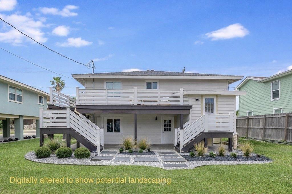 Very popular rental and no HOA! Centrally located Port A beach home with designer touches and open floor plan, with room for a large pool in the backyard. Enjoy all that Port A has to offer, so close to the beach, restaurants, fishing pier, City marina, shopping, and its golf cart accessibility makes it even easier to get around. This 2 bedroom 3 bath home boasts an oversized front porch that now wraps around to the backyard, beautiful remodeled kitchen, Shiplap walls, designer lighting and custom tile work. Downstairs is accessed separately as finished storage/ flex space and an extra bathroom, ready for your fishing and beach gear with water resistant vinyl flooring. The brand new wrap around deck leads you to the backyard patio and downstairs bathroom with exterior and interior access for future pool and pool house concept! Incredibly large backyard along Harper Street, a quiet dead end road, that is an ideal space for a pool, garden, parking or boat storage. Outdoor Oasis to be completed soon. There is also a 1 car garage! Ask for pool pricing, owner is a contractor and will complete with contract and negotiated deposit. Photos of backyard with pool, fence and landscaping are only renderings, AC installed in July 2022. Come see this great beach house, make it yours and "Get On Island Time!"