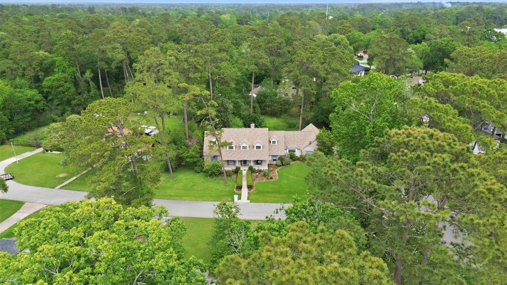 Spanning almost 3/4 acre across three combined lots, this rare River Plantation property offers exceptional space, privacy, and flexibility rarely found in the neighborhood. This 4,274 sq ft residence features 5 bedrooms, 3 full baths, and 1 half bath with a thoughtfully designed layout. The main level includes two bedrooms, two full baths, formal and informal living spaces, and a dining area. Upstairs offers three bedrooms, a full bath, and a spacious flex room ideal for a game room, media room, or additional living space. The private backyard is designed for entertaining with a heated pool, mature landscaping, and a three-person sauna. Three-car garage with built-in dog wash. Roof replaced approximately 6 months ago. Located on a quiet corner lot, high and dry, never flooded, with convenient access to I-45 and The Woodlands.