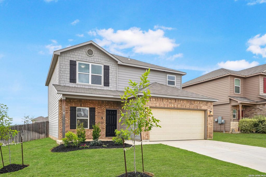 This beautifully maintained two-story home sits on a spacious corner lot in the desirable Saddle Ridge Estates community, offering the perfect blend of comfort, functionality, and location. Built in 2022 and featuring over 2,000 sq ft, this home delivers modern finishes and a layout designed for everyday living. Step inside to an open-concept main level with a bright and inviting living and dining space that flows seamlessly into the kitchen. The kitchen is equipped with granite countertops, ample cabinetry, stainless steel appliances, and a center island perfect for entertaining or casual dining. A convenient half bath and laundry room are also located downstairs. Upstairs, you'll find a spacious primary suite with a private en-suite bathroom and generous closet space, along with three additional bedrooms and a full secondary bathroom. The layout provides flexibility for guests, home office space, or growing households. Out back, enjoy a private yard with a large patio offering a peac