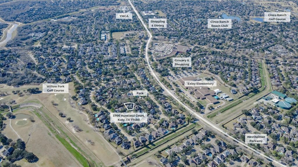 FABULOUS 5 BEDROOM (2 DOWN) 4 FULL BATH W/POOL/SPA & 3 CAR TANDEM GARAGE NESTLED ON A 10,000 SQ FT+ PRIVATE GREEN SPACE CUL DE SAC LOT BACKING TO A PARK! Grand entry w/Formal Dining & Office/Study. Huge Island Kitchen w/beautiful cabinetry, double ovens, & built-in desk area. Spacious Family Room w/huge buffet storage, gas log fireplace & hard wood flooring. Primary Bedroom w/Ensuite Bath. Upstairs leads to 3 Large Secondary Bedrooms, Game Room, Media Room & 2 Full Baths. Plantation shutters. New Carpet. Fresh Paint. *AMAZING LOCATION* - Elementary school across the entrance to the neighborhood. Minutes from two golf courses - Willow Fork Country club & Cinco Ranch Golf Course. Walking distance to two neighborhood parks and trail entrances. Cinco Ranch amenities include 11 pools, parks, wooded trail system, tennis/pickleball courts, lakes and more! Excellent commute options including I-10/Westpark Tollway/Grand Parkway & Westheimer. ROOF 2019 & HVAC 2017. LOW TAXES. NEVER FLOODED!