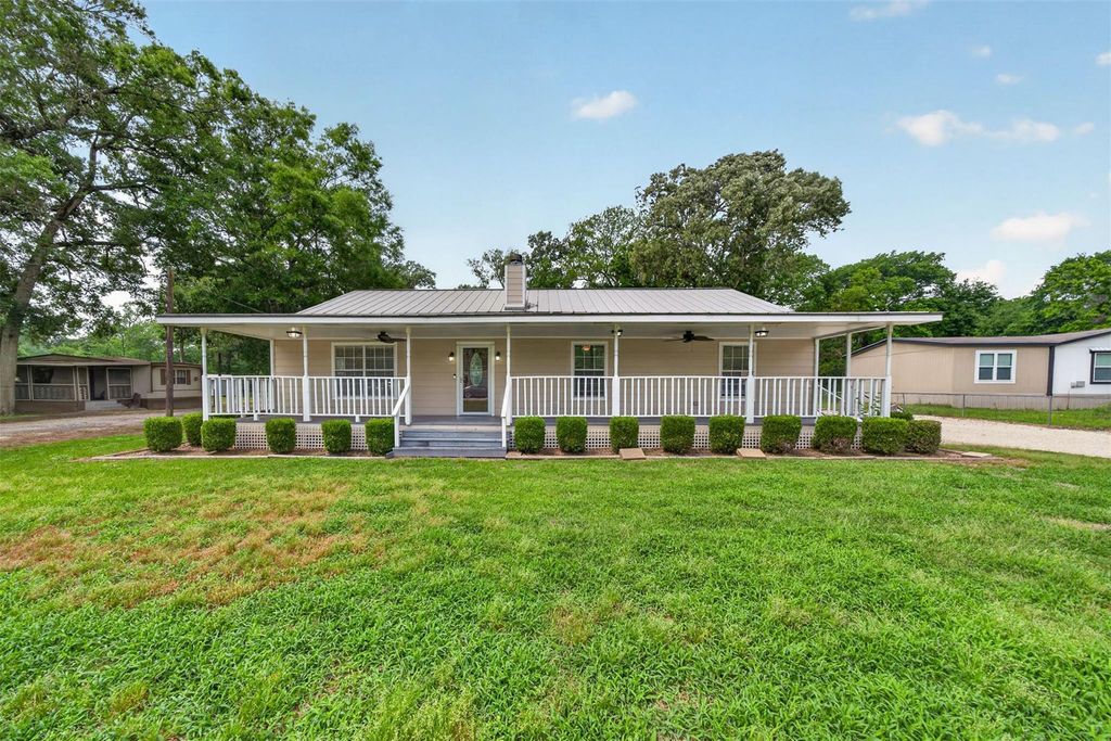 Unrestricted and fantastic single-story home on a large lot boasting mature trees for added privacy, a fenced backyard, charming curb appeal with a sprawling front porch, extended back deck, and a 30x25 workshop! This home offers a 50 amp plug and breakers for a generator, wood laminate flooring throughout, tiled bathrooms, a huge living area with a fireplace, utility room in-house, dining area, and island kitchen with ample cabinet storage! You'll also find oversized bedrooms including the primary suite with a walk-in closet, dual sinks, soaking tub, and separate shower. Proximity to TX-99 and I-10 within 15 minutes. Enjoy country living on a quiet, cul-de-sac ending street with no HOA or MUD tax!