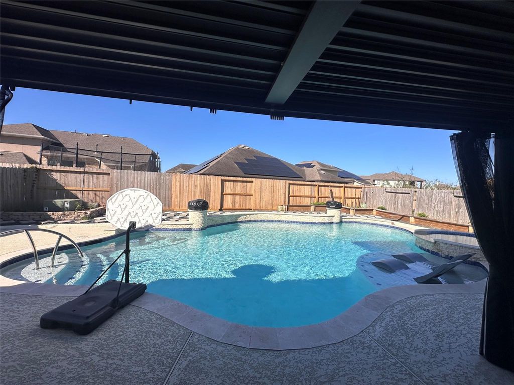Stunning 5bd/4.1ba residence welcomes you with a grand 8ft front entry door & impressive staircase. A private study with French doors and soaring ceilings offers the perfect space for working/learning from home. Formal dining room provides opens to the beautifully appointed kitchen, complete with 42” dark wood cabinetry,SS appliances, upgraded fixtures, under-cabinet lighting, large island & abundant counter space. Generously sized primary suite w en-suite bath including oversized shower, jetted tub, dual vanities, linen storage, and spacious walk-in closet. Secondary bd down. The main living area is bright and open, w remote-start fireplace & views to the 2nd fl, all seamlessly connected to the kitchen. 2nd fl features a media room pre-wired for surround sound ideal for entertaining, & 3 bdrs. Step outside to your backyard retreat with a large pool & hot tub, covered patio. The garage is equipped with built-in cabinets, sink, water filtration system, & reverse osmosis. Zoned to CCISD.
