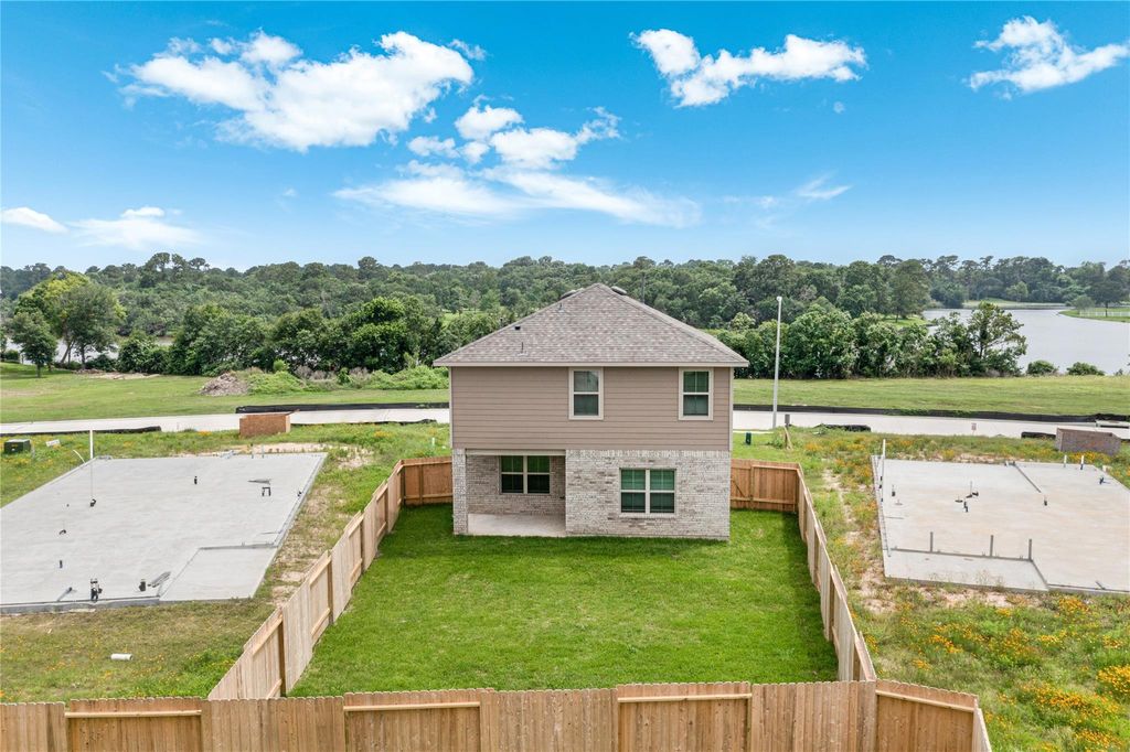 Elegance awaits in this exquisite 2-story, 4-bedroom, 2.5-bath new construction home. With a generous 1915 sqft, this residence is in highly sought after Dickinson ISD, where you can savor the tranquil lake from your own covered back patio. Step inside and be greeted by tall ceilings that amplify the sense of space. Crown molding w high 5 1/2 inch baseboards adorn the interiors, Rockfort style 5-panel interior doors & a touch of charm & showcasing attention to detail. The heart of this home is the architecturally designed kitchen. Granite countertops complement the stainless steel kitchen appliances, creating a stylish and functional space. The large 42"x36" shower and garden tub in the primary bath offer a serene escape, while the double sinks in both primary and secondary baths ensure convenience. The VLP floors in family room, kitchen, dining areas, baths, and utility room combine aesthetics with easy maintenance.