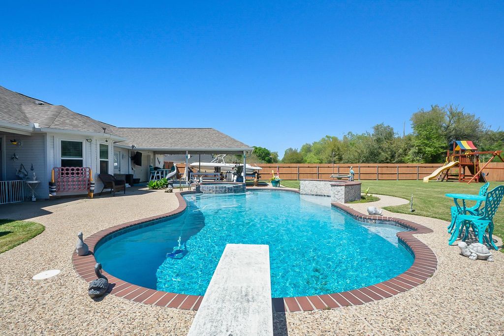 Beautiful 1-story brick home on a quiet dead-end street on over half an acre! 2022 updates include new windows, AC/heater, laminate flooring, breaker box, 10x20 shed, replastered pool, and generator. Spacious living area with fireplace, primary suite with tray ceilings and attached study/office, plus garage flex room or 4th bedroom option. Enjoy a large covered patio, huge yard and a beautiful pool, perfect for summer. No HOA and convenient to Hwy 646 with shopping and dining nearby. Make your appointment today!
