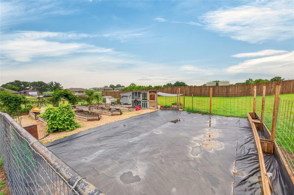~1+ acre fenced lot ~No HOA + rural feel ~True 4 bed + office ~No carpet throughout ~Covered patio + pergola ~Garden + chicken coop! Set on over an acre with only one neighboring house, this well-kept home offers space, privacy & flexibility with no HOA. A welcoming brick exterior & covered front porch set the tone, while inside the layout delivers a true 4-bedroom design plus a dedicated office & two dining areas. The split-bedroom floorplan creates separation, with the primary suite tucked away for added privacy. The main living area features rich wood flooring, a corner fireplace & an open flow into the kitchen, making it ideal for everyday living or entertaining. The kitchen is finished with granite counters, stainless steel appliances, double pantries, dark cabinetry & a bold tile backsplash, connecting seamlessly to both dining spaces for casual or formal use. No carpet anywhere—LVP runs through bedrooms, office & halls, wood floors anchor the living room, & tile covers kitchen & dining areas for durability & easy maintenance. The primary suite offers generous space, natural light, a walk-in closet & a well-appointed bath with dual sinks & a large walk-in shower. Secondary bedrooms are well-sized with convenient access to a full bath. Large closets throughout the home & the utility room add extra storage & workspace. Step outside to a covered patio with a pergola extension, perfect for relaxing or hosting. The fully fenced yard includes raised garden beds, a side butterfly garden, a chicken coop & a storage shed, giving the property both charm & versatility. Open green space allows for additional use while maintaining a clean, usable layout. Located just minutes from Springtown conveniences, including grocery, restaurants & Starbucks, this property balances country space with everyday access.